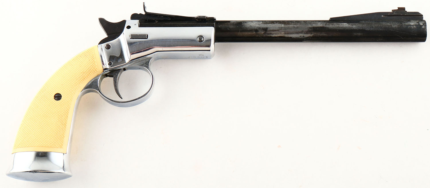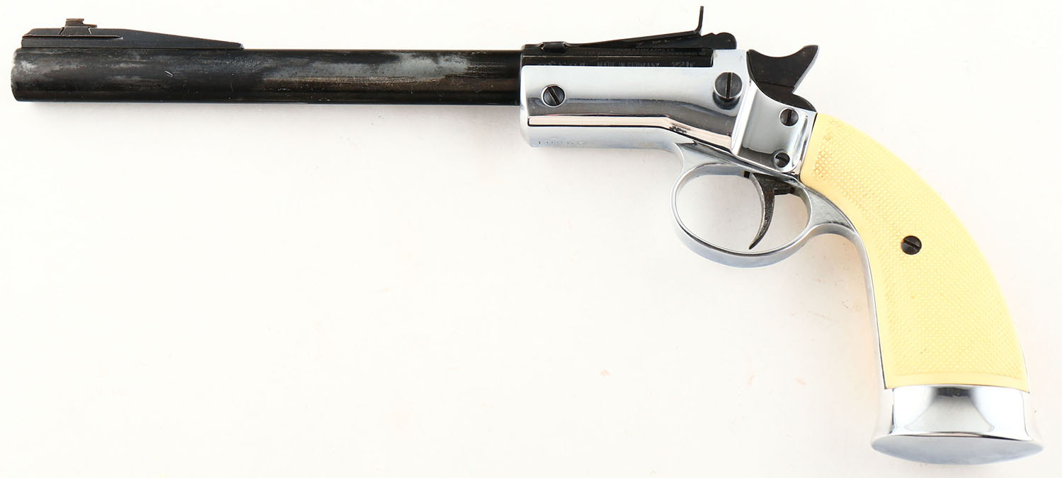 Hawes Firearms Co. (J.P Sauer), Tip-Up, CAL: 22LR, MFG: 1960's-70's, SN: 25501, Single Shot Pistol, 8'' barrel. The left barrel flats are marked ''HAWES FIREARMS CO./LOS ANGELES CALIF MADE IN WEST-BERLIN'' & ''25501 MADE IN GERMANY 22LR''. The checkered plastic grips are excellent. The black finish on the barrel rates 50-60% & the chrome/nickel finish on the frame is excellent. Bore is excellent. Elevation adjustable rear sight & ramp elevated blade front sight. FFL Req. - Value: 150 to 350