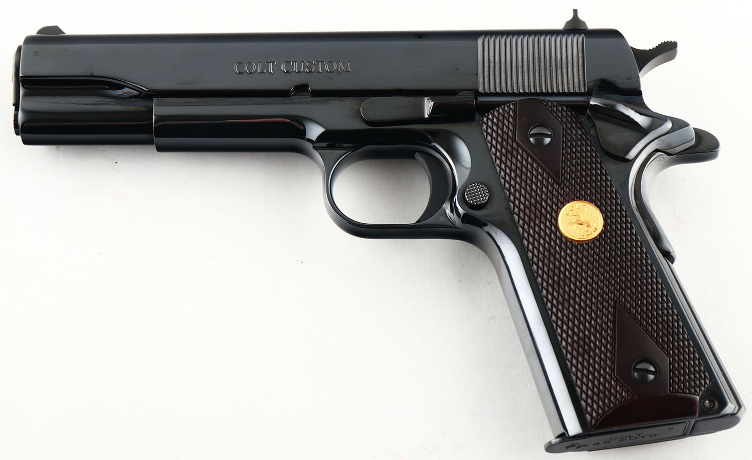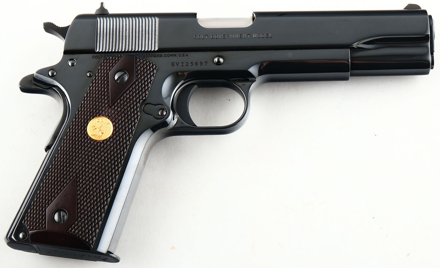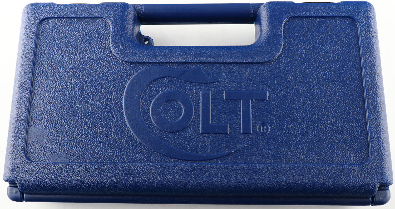 CASED, Colt, Colt Custom - Government Model Series 70 Model O, CAL: 45 AUTO NM, MFG: Modern, SN: GV225697, Semi Auto Pistol, 5'' barrel. Standard factory markings. The Colt logo medallion checkered wood grips are excellent. The high polish Royal Blue finish rates 99% overall. Bore is excellent. Fixed square notch rear sight & blade front. Comes in factory blue hard case, with lock, related paperwork & factory hang tag. A high condition example of a Colt Custom 1911. FFL Req. - Value: 1200 to 1500