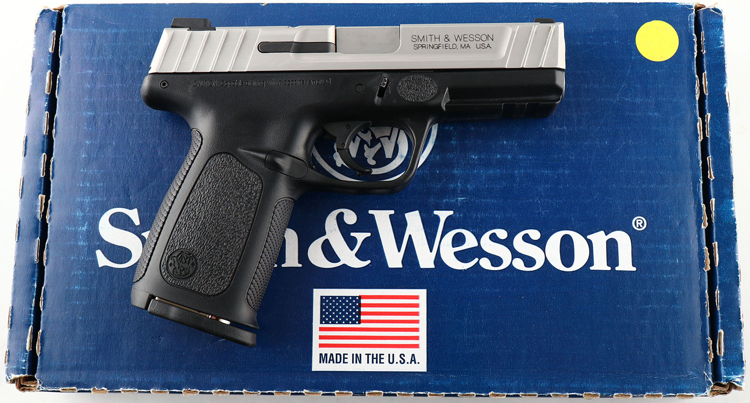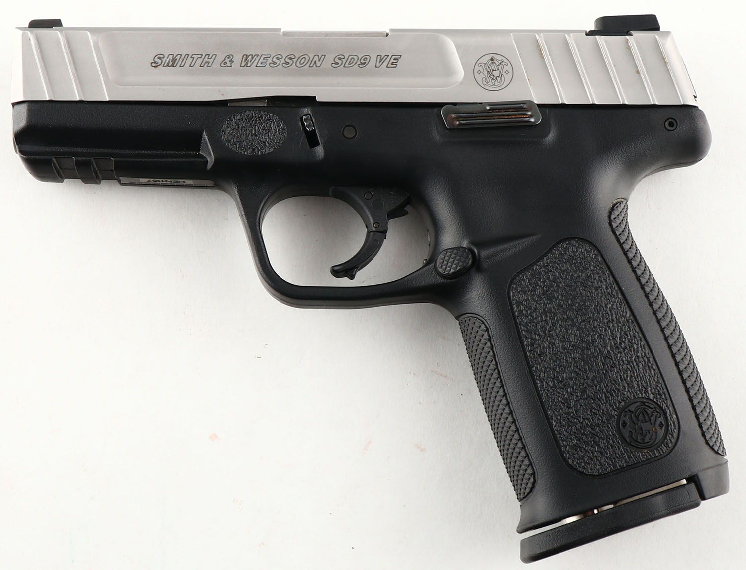 BOXED, Smith & Wesson, Model SD9 VE, CAL: 9mm, MFG: Modern, SN: HEN1187, Semi Auto Pistol, 4'' barrel. The S&W checkered polymer grip frame is excellent. The stainless steel finish on the slide is very good, with minor speckling in some of the slide serrations. Factory sights. Comes in factory box, with extra mag & test fire cartridge. FFL Req. - Value: 300 to 400