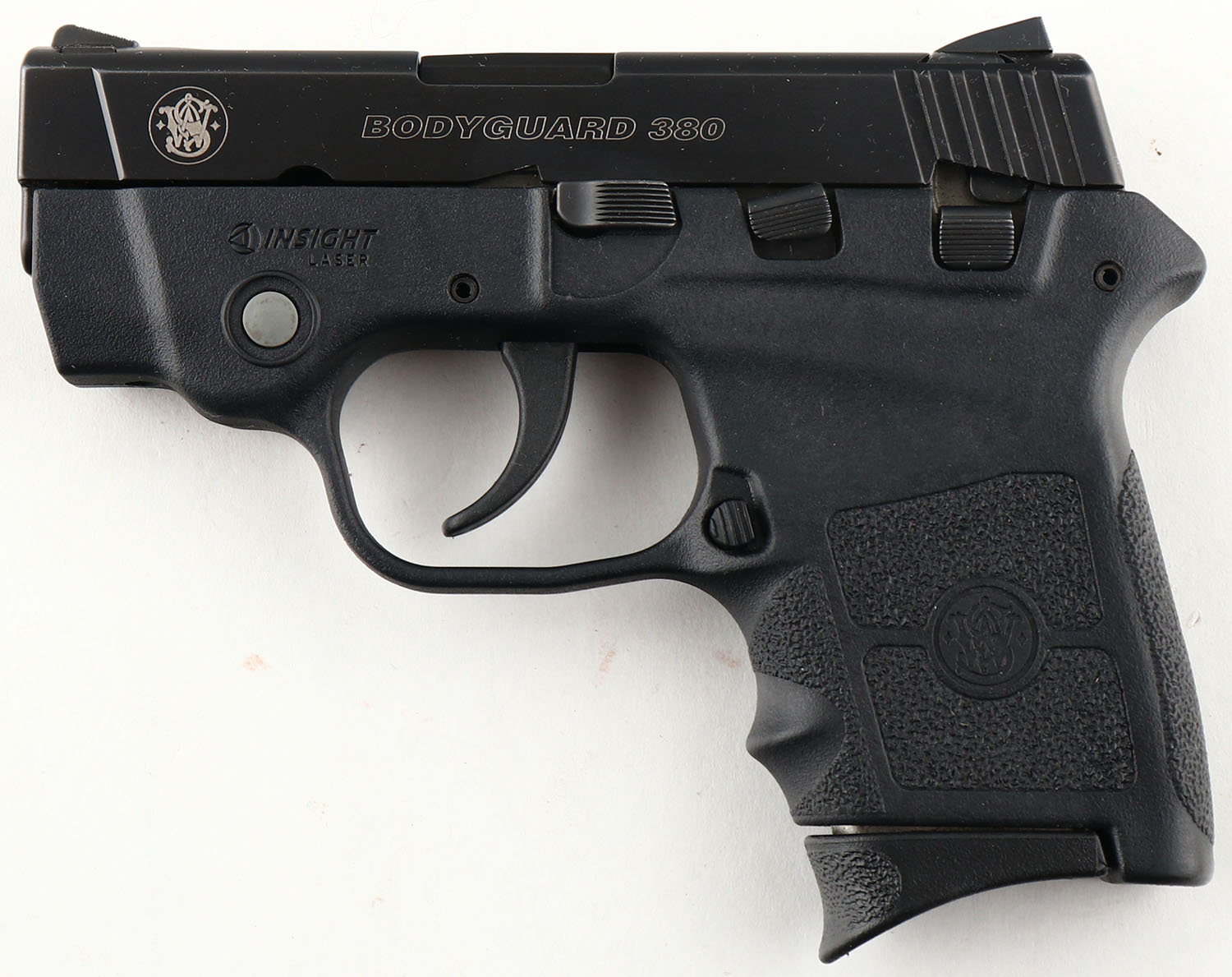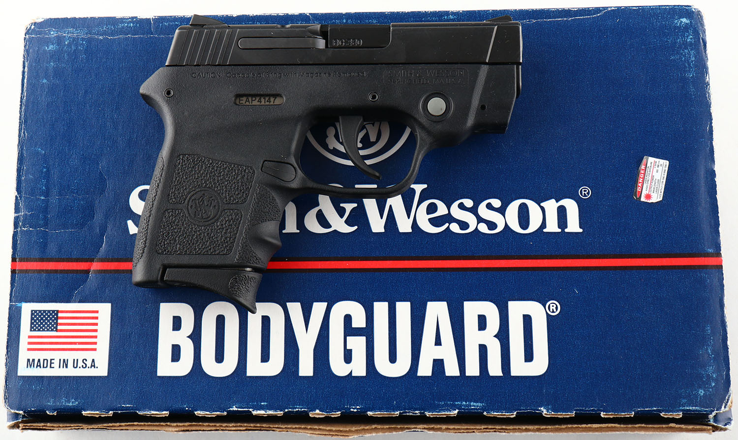 BOXED, Smith & Wesson, Bodyguard 380, CAL: 380 AUTO, MFG: Modern, SN: EAP4147, Semi Auto Pistol, 2 3/4'' barrel. Standard factory markings. The S&W Insight Laser textured polymer grip frame is excellent. The matte black finish on the slide rates 99%. Bore is excellent. Serrated square notch rear sight & serrated blade front sight. Comes in factory box, with lock, test fire ctg., & related paperwork. FFL Req. - Value: 250 to 400