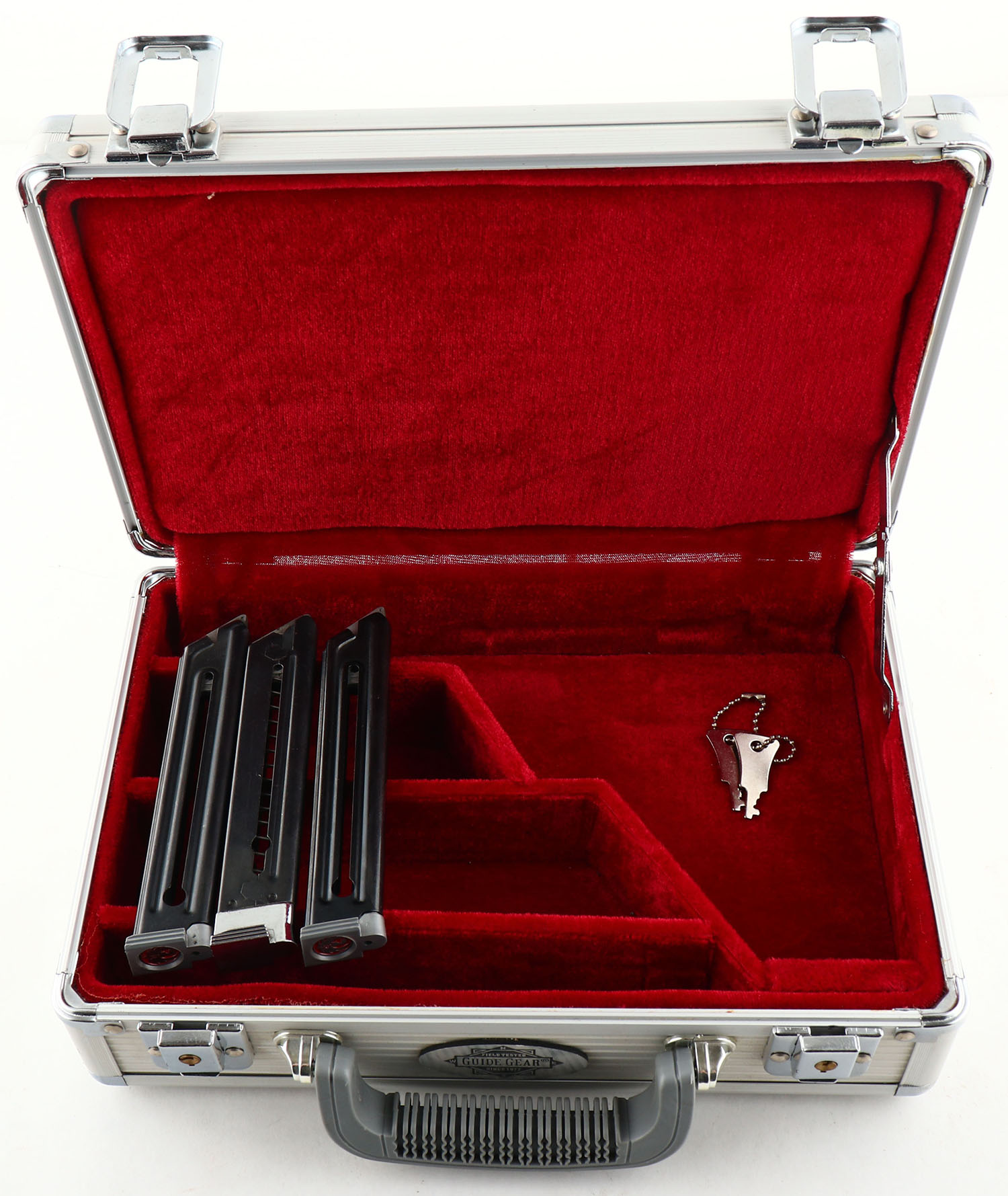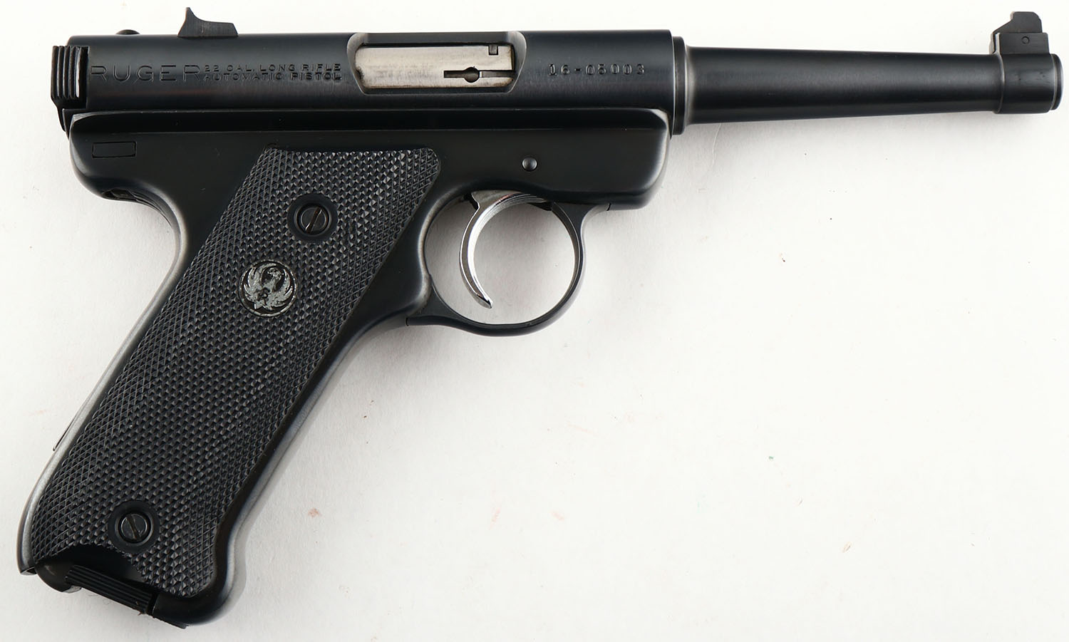Ruger, Standard, CAL: 22LR, MFG: 1979, SN: 16-05003, Semi Auto Pistol, 4 3/4'' barrel. Standard factory markings. The Ruger logo medallion checkered plastic grips are excellent. The Ruger medallion shows some wear. The original metal blue finish rates 99% overall. Bore is excellent. Fixed square notch rear sight & elevated blade front sight. Comes in Guide Gear hard case, with (3) extra mags & case keys. FFL Req. - Value: 200 to 400