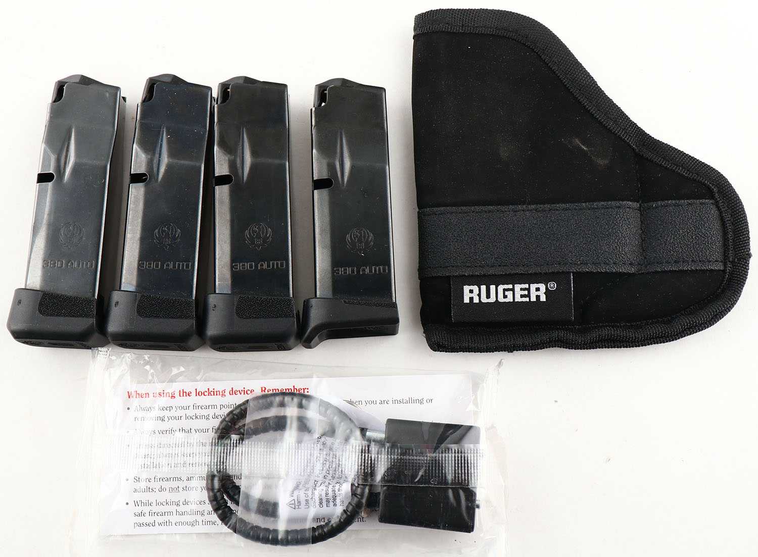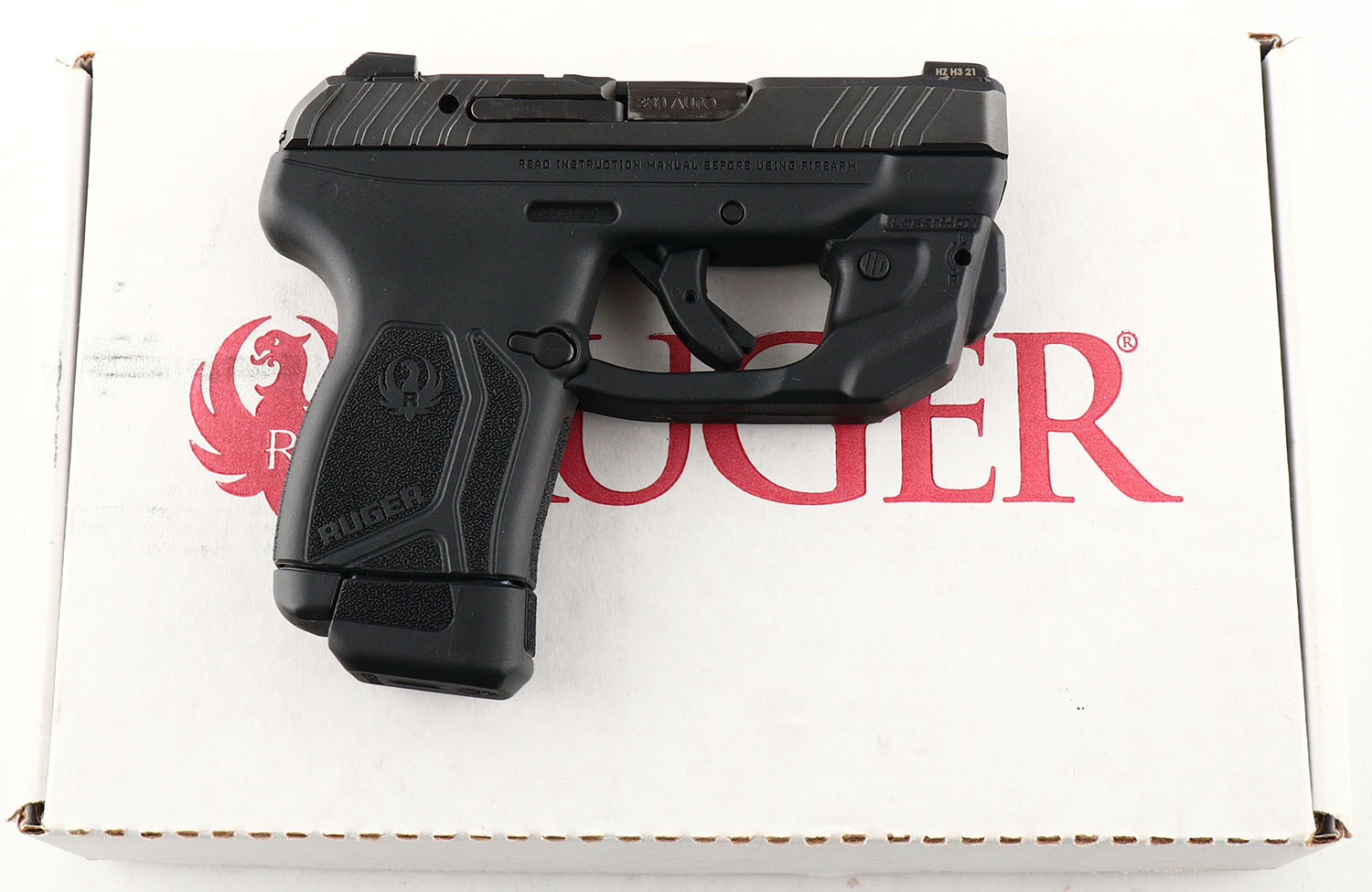 BOXED, Ruger, LCP MAX, CAL: 380 Auto, MFG: Modern, SN: 381357215, Semi Auto Pistol, 2 3/4'' barrel. Standard factory markings. The Ruger textured polymer grip frame is excellent. LaserMax trigger guard extension (needs battery). The matte black finish on the slide rates 99%. Bore is excellent. Serrated rear sight & Tritium front sight. Comes in factory box, with (4) extra mags, Ruger soft holster, lock & related paperwork. FFL Req. - Value: 300 to 450