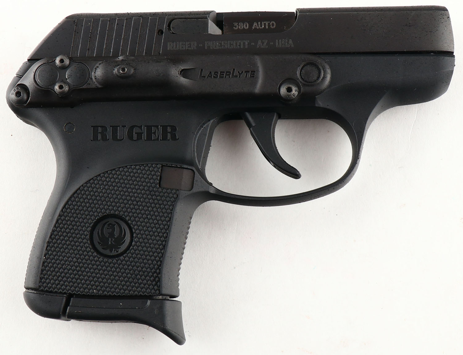 Ruger, LCP, CAL: 380 AUTO, MFG: Modern, SN: 373-80670, Semi Auto Pistol, 3 1/2'' barrel. Standard factory markings. The Ruger textured polymer grip frame is excellent. LaserLyte on right side of frame (needs battery). The matte black finish on the slide rates 99%. Bore is excellent. Integral square notch rear sight & low profile blade front sight. Comes with (2) extra mags, a fanny pack & Uncle Mike's holster. FFL Req. - Value: 200 to 350