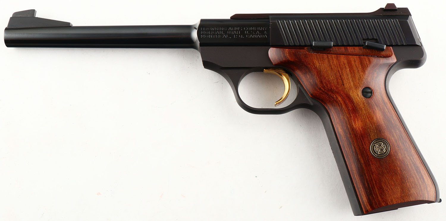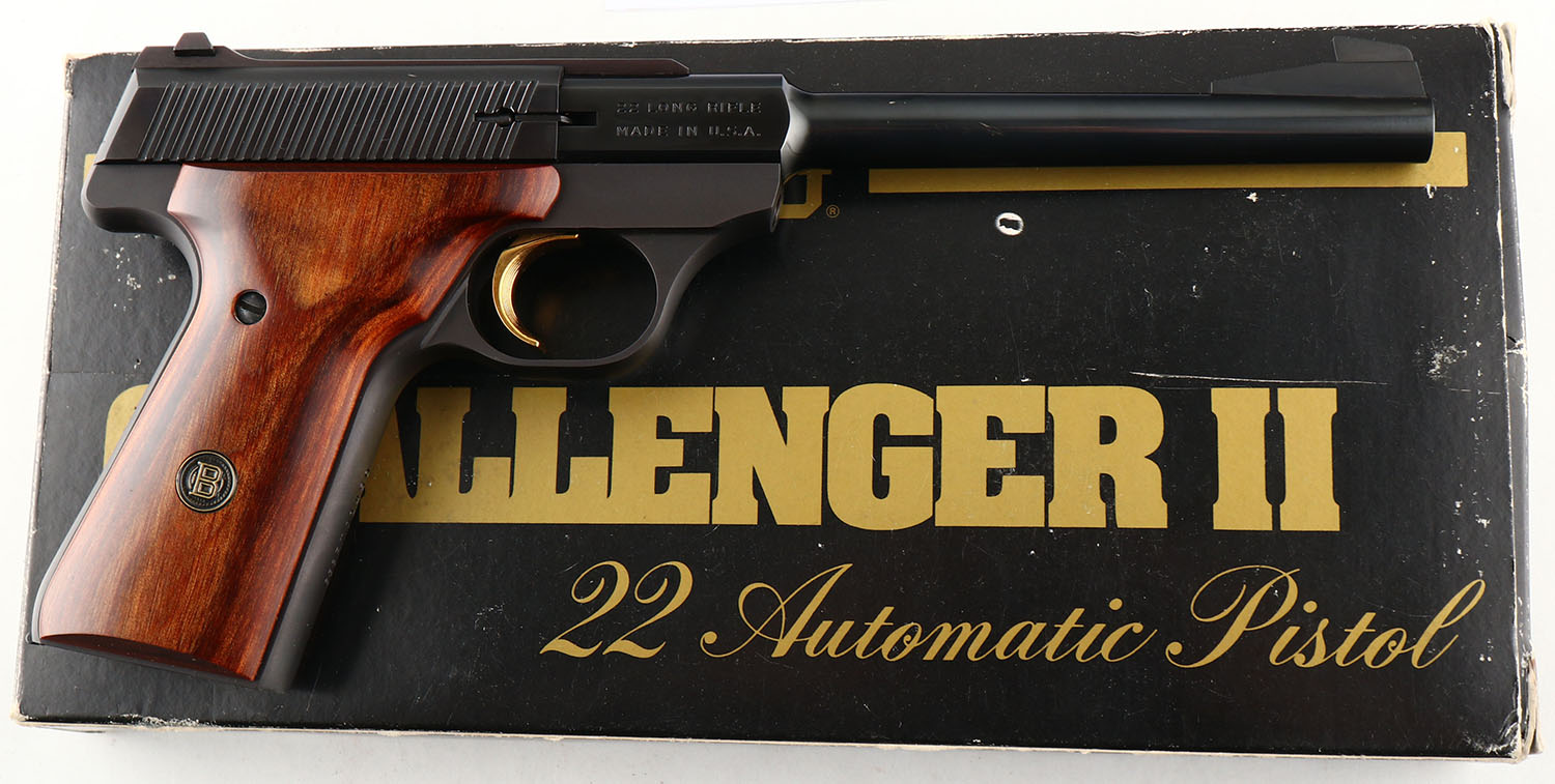 BOXED, Browning Challenger II, CAL: 22LR, MFG: 1976, SN: 665RT01450, Semi Auto Pistol, 6 3/4'' barrel. The Browning logo medallion wood grips are excellent. The gloss finish is excellent. The original metal blue finish rates 99%+ overall. Gold tone trigger. Adjustable rear sight & ramp elevated blade front sight. Comes in original box. Box condition is very good, with a small slit on the lid, along with light edge, corner & shelf wear. FFL Req. - Value: 400 to 550