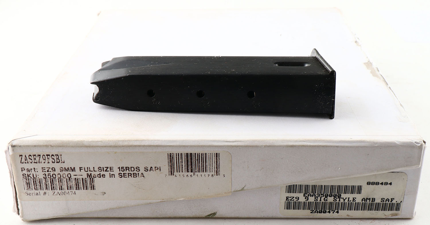 BOXED Zastava, Model EZ9, Semi-Auto Pistol, CAL: 9mm Para, MFG: 2007-11, SN: ZA00474, 4'' barrel, Made in Serbia. The checkered black plastic grips are excellent. The original metal blue finish rates 100%, Bore is excellent, Factory 3 white dot front & back sights. Comes in factory original SN matching white box, with some tape repairs. Comes with two 15 rd mags, paperwork, cleaning brush & trigger lock. NIB vintage old stock. FFL Req. - Value: 400 to 800