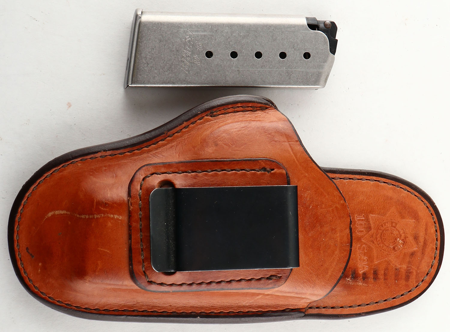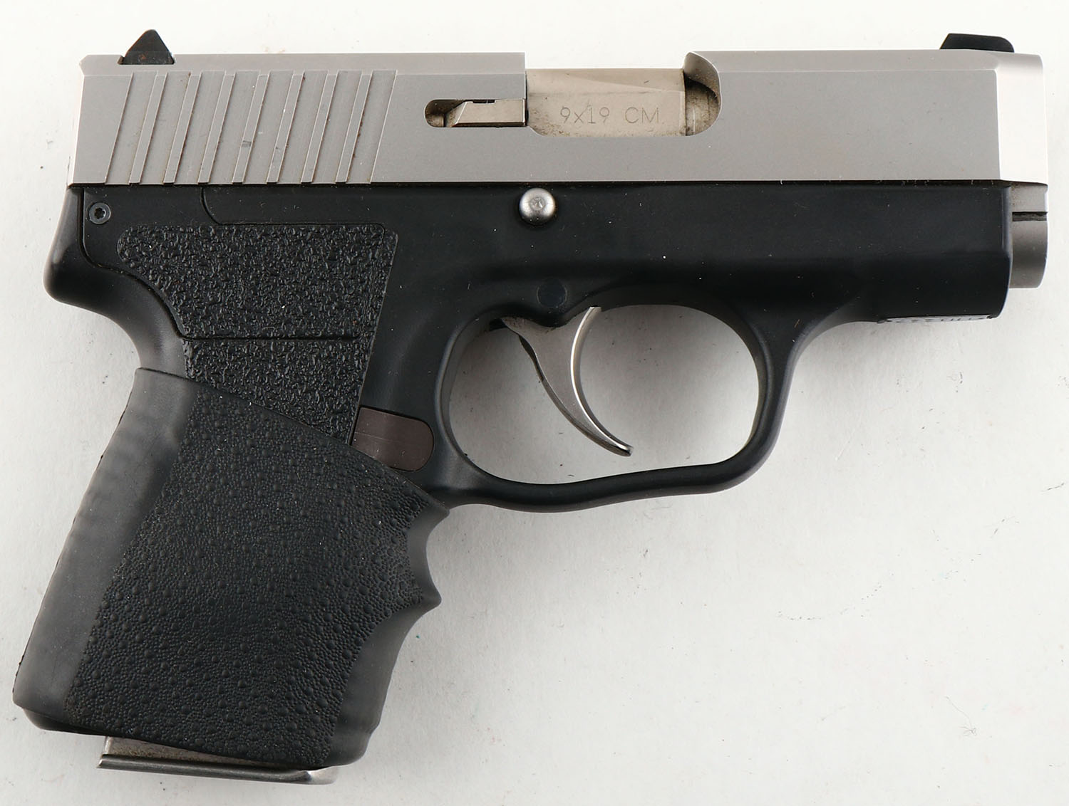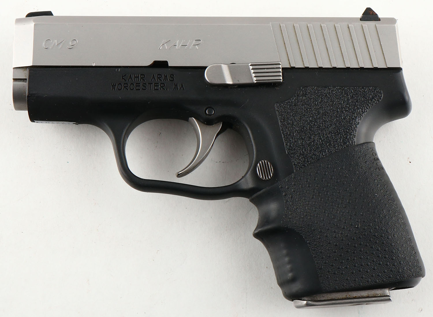 Kahr, Model CM9, 9mm, Semi-Auto Pistol, Mfg. Modern, SN: IN1227, 3'' barrel, The integrated synthetic grips are excellent, but also comes mounted with finger grip rubber sleeve for improved grip & handling. The matte silver finish on slide, barrel & trigger rates 99%. Mechanically sound. Bore is excellent. Comes with two original 6 round factory mags. Comes with an excellent Bianchi International leather clip holster which fits the pistol perfectly. An excellent compact 9mm personal carry pistol. FFL Req. - Value: 350 to 500