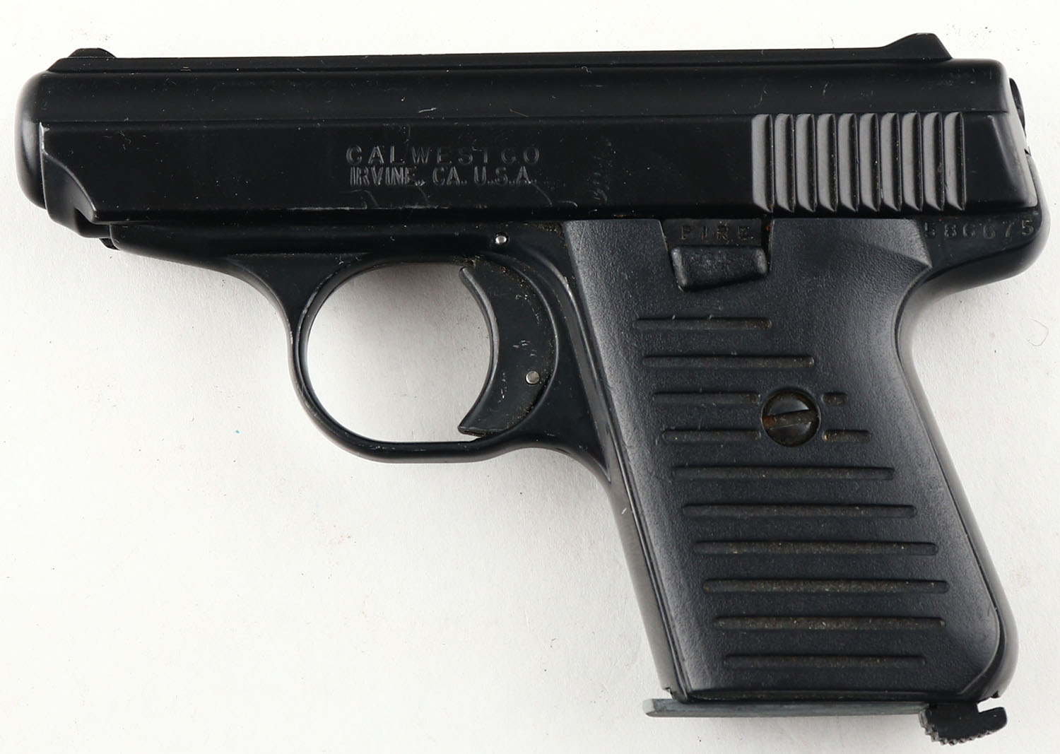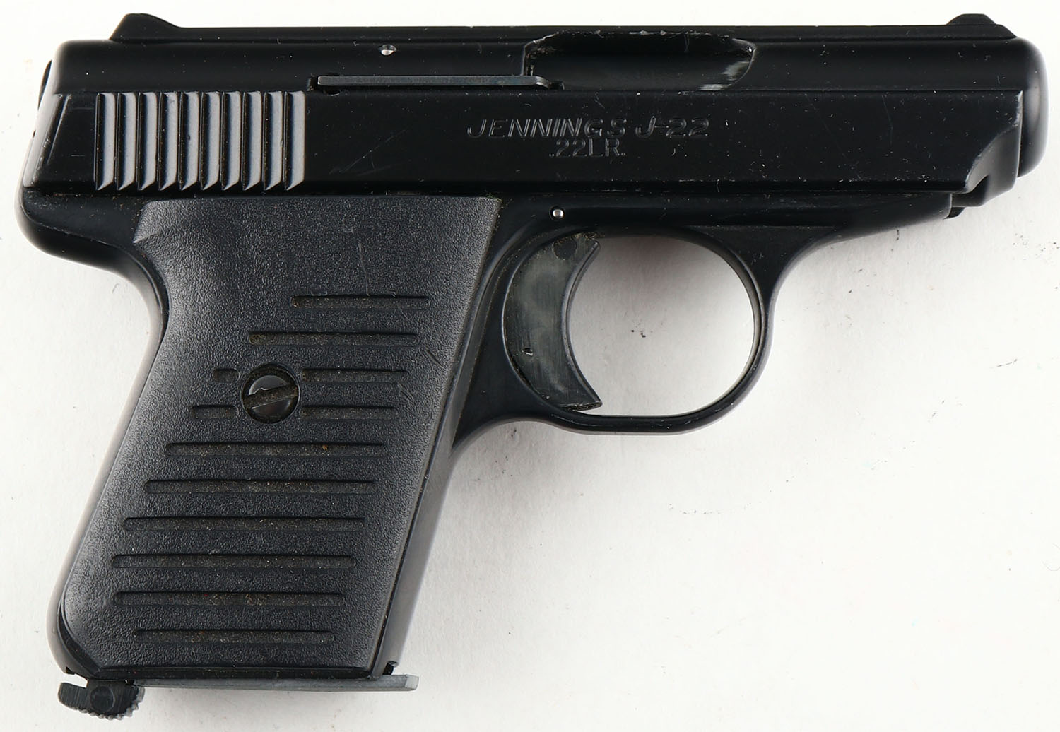 Jennings, J-22, CAL: 22LR, MFG: 1978-Present, SN: 586675, Semi Auto Pistol, 2 1/2'' barrel. The grooved synthetic grips are excellent. There are minor scrapes & dings. The matte black finish on the slide & frame rates 95% overall. Bore is very good, bright, with visible striations. Fixed square notch rear sight & low profile blade front sight. Comes in soft carrying case, with extra mag & owners manual. FFL Req. - Value: 80 to 150