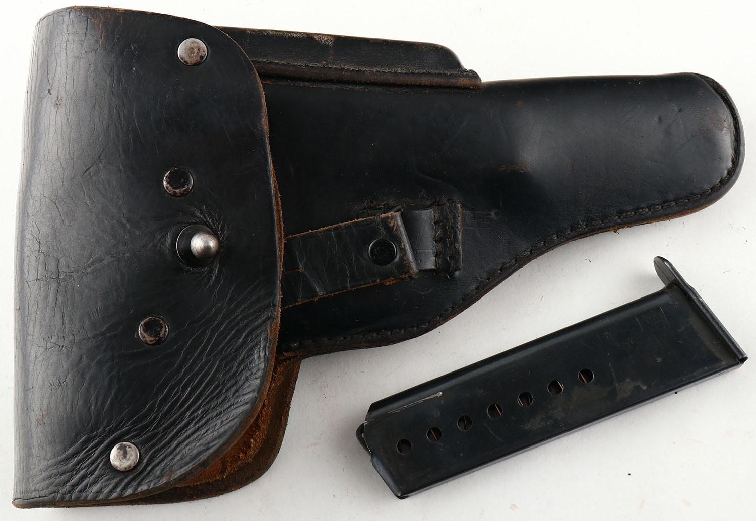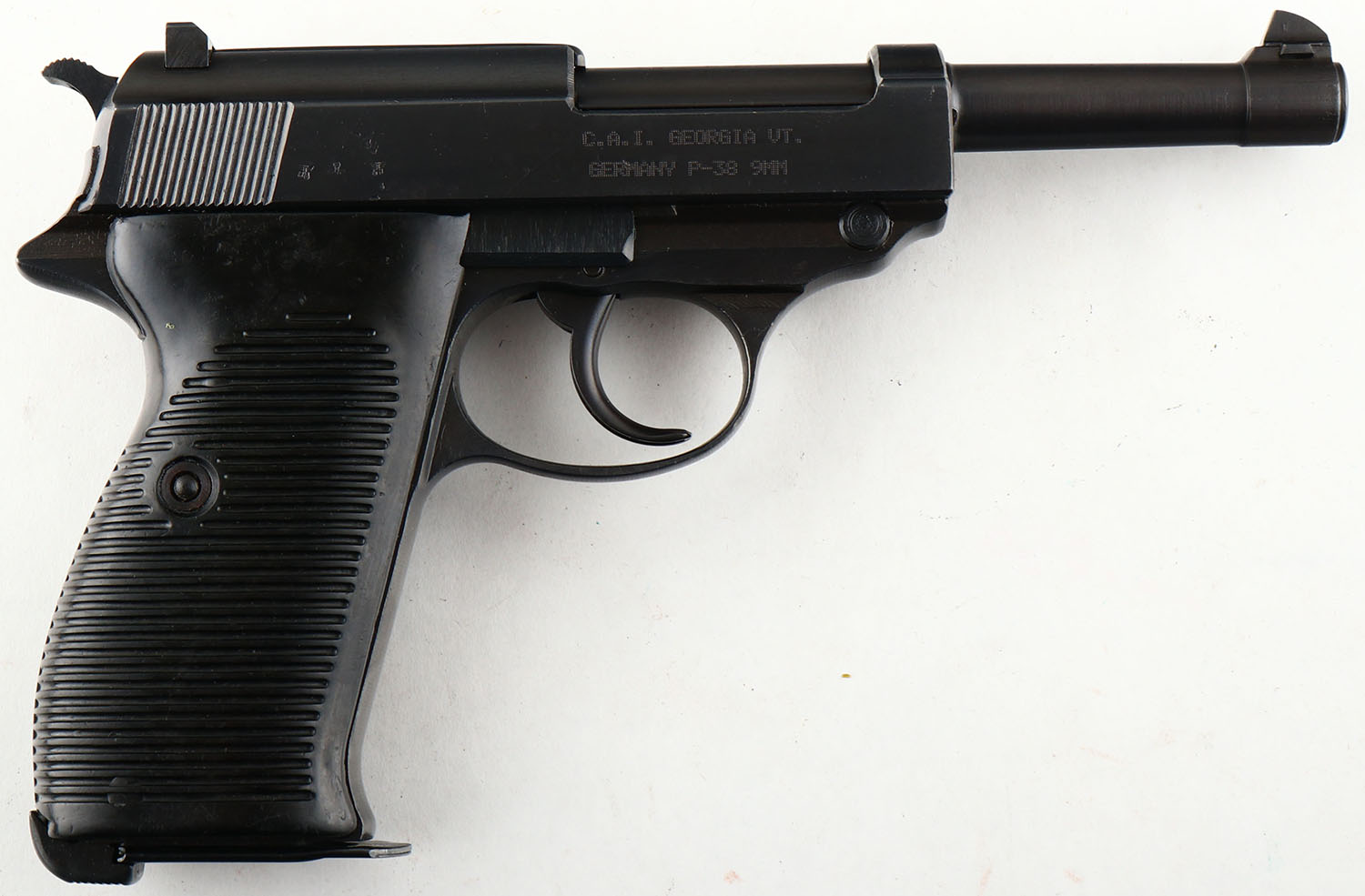 Spreewerk, P.38 Russian Capture, CAL: 9x19mm, MFG: Dec. 1943, SN: 3416K, Semi Auto Pistol, 5'' barrel. The left side of the slide is marked ''P.38'', ''cyq''. ''3416 K''. The left side of the frame is marked ''3416'', ''Waffenampt'', ''k''. The right side of the slide is marked with the import stamp & German proofs. The grooved plastic grips are excellent, with minor scrapes & dings. This example was a Russian capture & carries a Russian re-furbishment mark. The re-furb finish is excellent overall. Bore is good, bright, but with consistent roughness & intermittent pitting. Fixed U-Notch rear sight & blade front sight. Comes with German P.38 holster, carrying an extra mag. FFL or C&R Req - Value: 600 to 1200