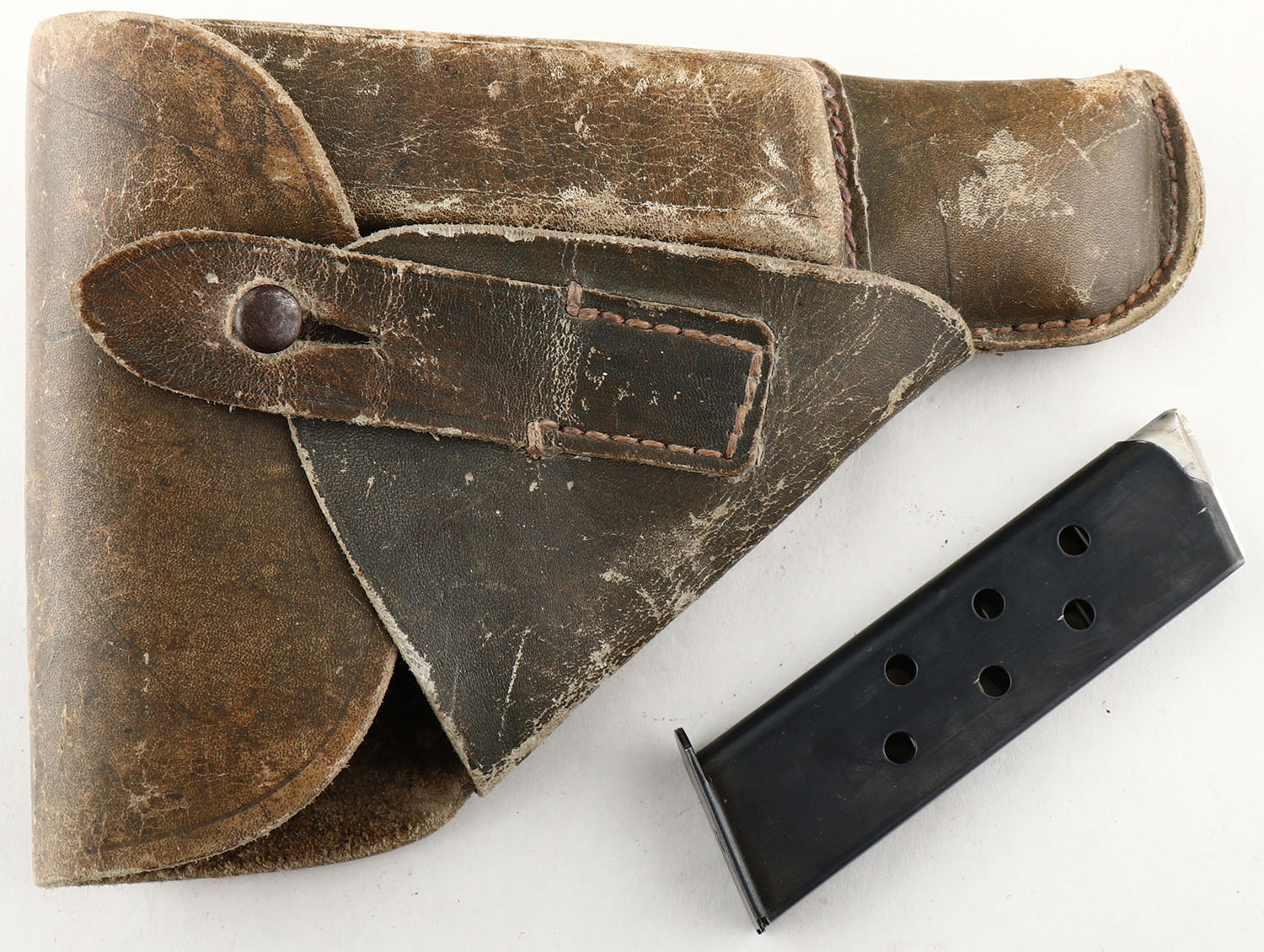 Mauser, Model 1914, CAL: 7.65 (32), MFG: 1920, SN: 263094, Semi Auto Pistol, 3 1/4'' barrel. This is a non-functioning firearm. The left side of the slide is marked with standard name/address stamp, serial number & manufacture date. The right side of the slide is marked ''MAUSER-7.65''. The original wood grips are very good & solid. There are minor scrapes, dings & checkering has worn smooth. The original blued finish rates 80%, with areas worn to metal gray & toned to a brown patina. Bore is good & bright, with consistent roughness & intermittent light pitting. Fixed U-notch rear sight & blade front sight. Comes with a period correct holster carrying an extra mag. Parts Gun/Gunsmith Special. Sold as-is, no returns. FFL or C&R Req. - Value: 100 to 200