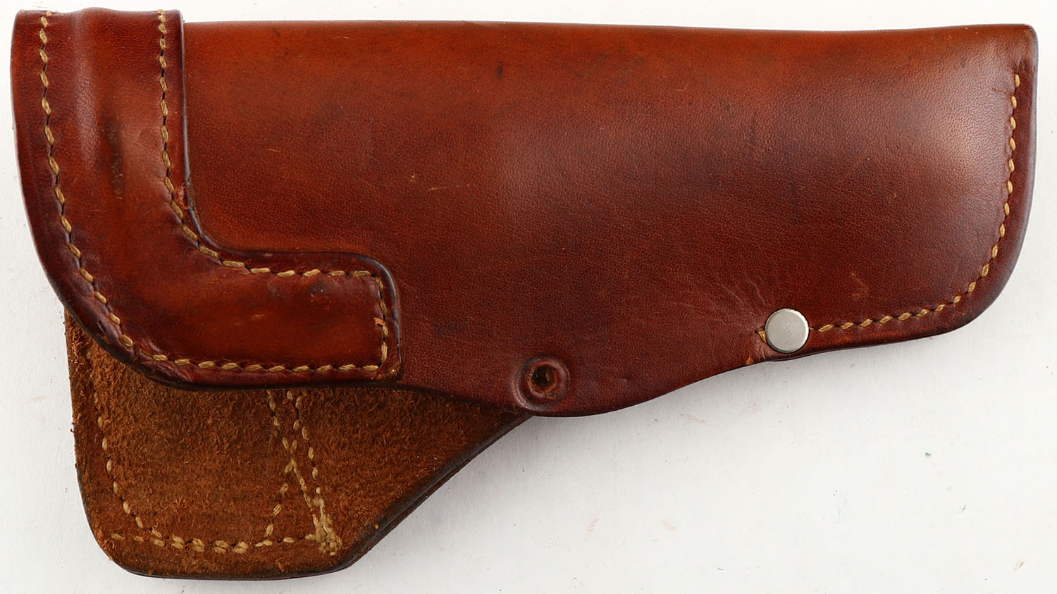 Astra, Model 1916, CAL: 7.65, MFG: 1920's, SN: 77472, Semi Auto Pistol, 3 1/2'' barrel. Standard factory markings. The original checkered wood grips are very good & solid. There are some minor nicks, dings & small areas of smooth checkering. The original metal blue finish rates 85% overall. Bore is good, bright, but consistently rough. Fixed rear sight & blade front sight. Comes with Bauer Bros leather holster. FFL or C&R Req. - Value: 150 to 350