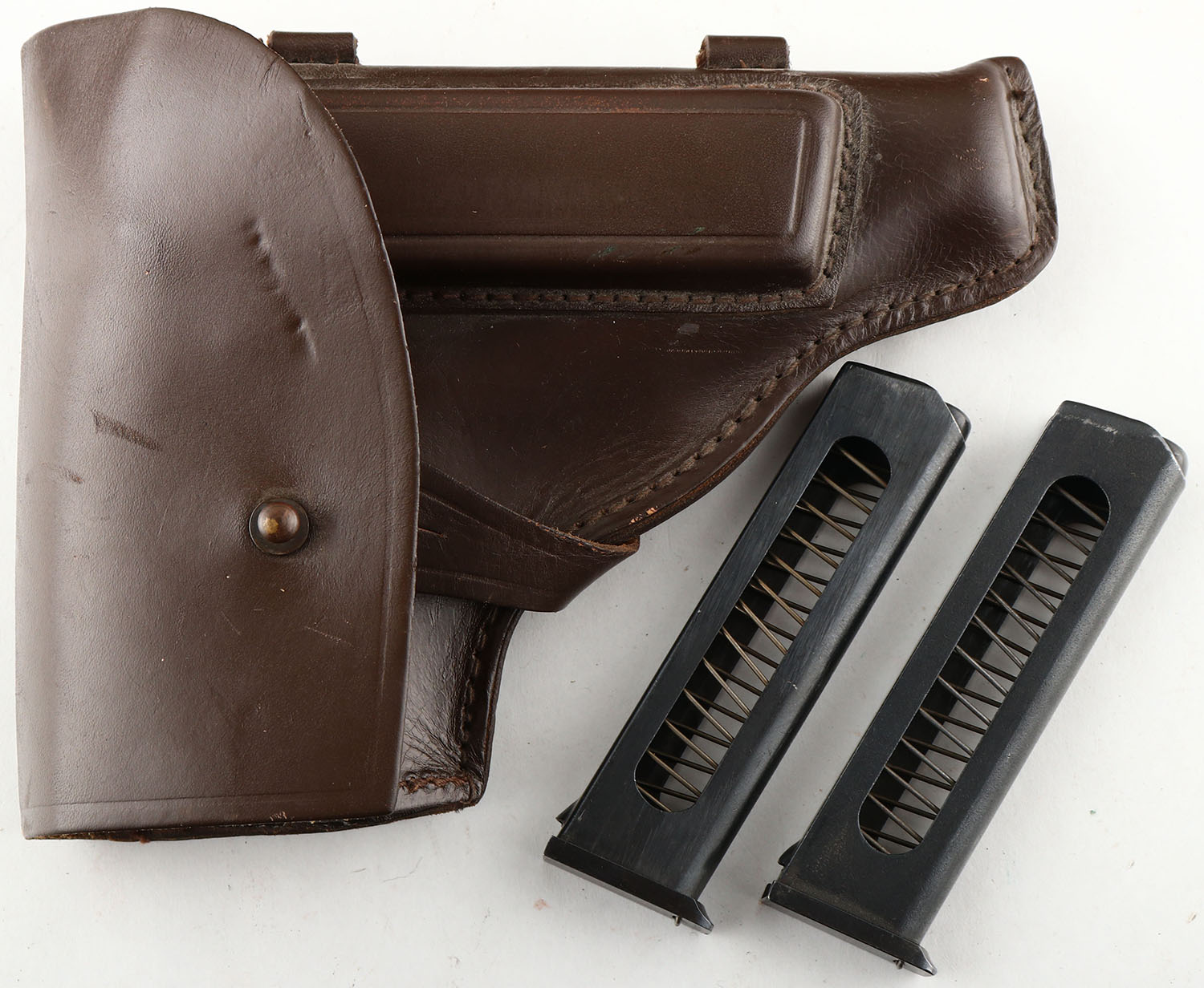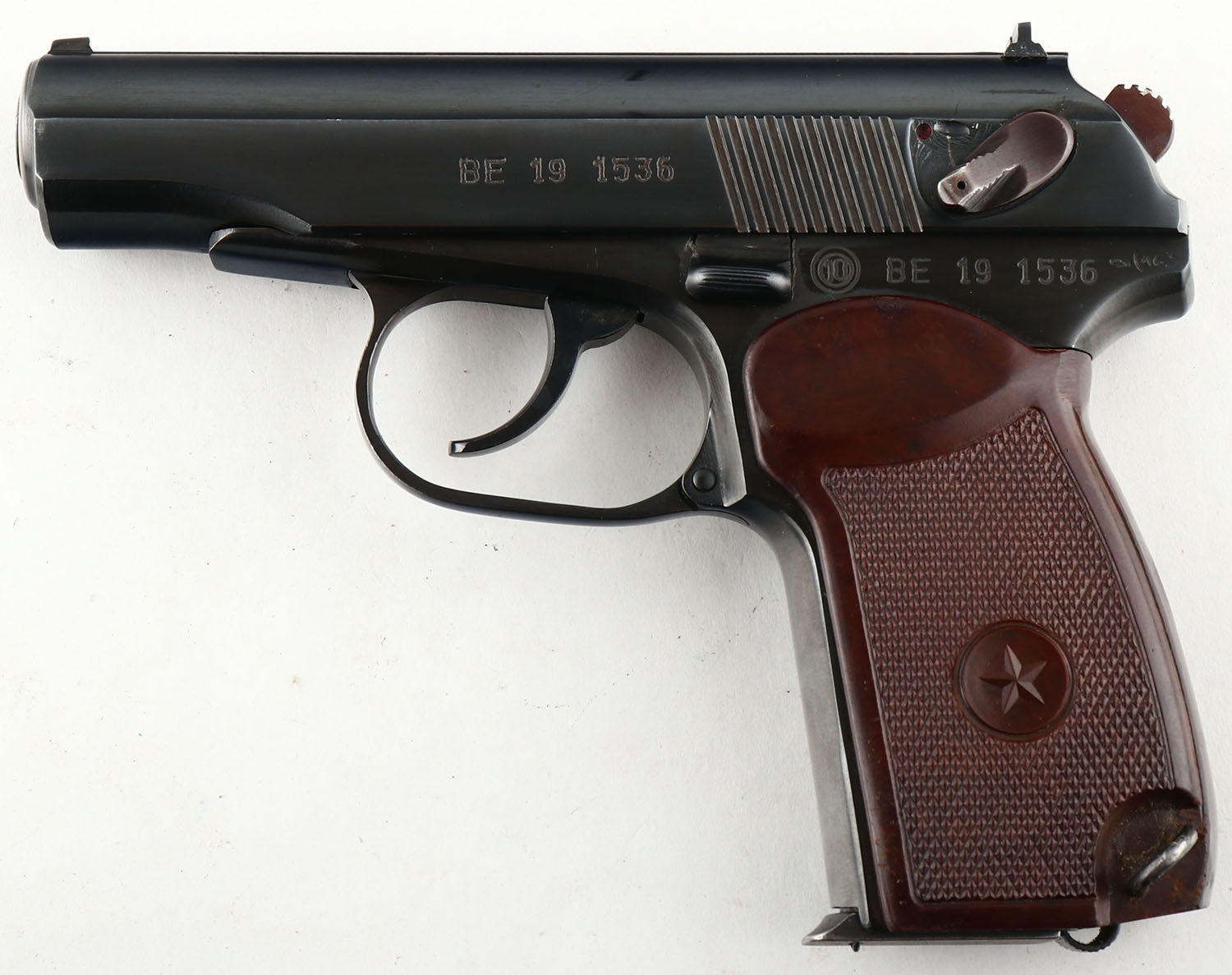Bulgarian (Factory 10), Makarov, CAL: 9x18 MAKAROV, MFG: 1971, SN: BE191536, Semi Auto Pistol, 3 5/8'' barrel. Factory markings on left side & import marks on the right side. The original checkered plastic grips are very good & solid. There are contusions, dings & overall light wear. The blued finish rates 95% overall. Bore is excellent. Fixed square notch rear sight & blade front sight. Comes with reproduction leather holster & (2) extra mags. FFL or C&R Req. - Value: 300 to 600