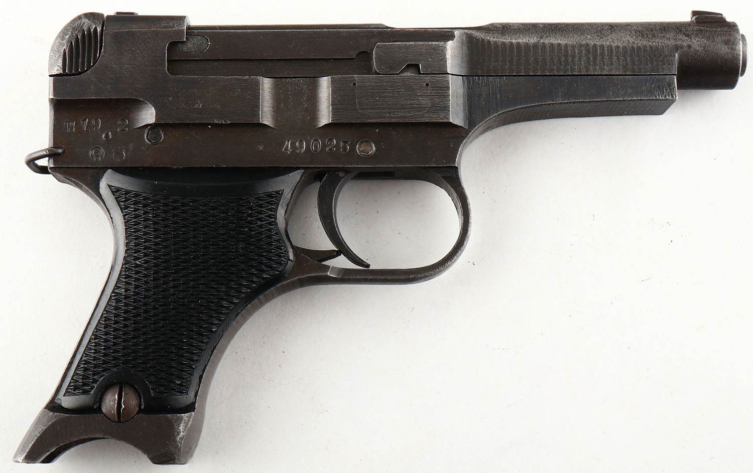 Nagoya, Nambu Type 94, CAL: 8x22 Nambu, MFG: 1944, SN: 49025, Semi Auto Pistol, 3 3/4'' barrel. Factory markings on the left & right side of frame. The original checkered plastic grips are excellent. There are minor nicks & dings to the edges. The original metal finish is good, with spotting throughout, toned to a brown patina. Bore is good, with roughness & intermittent spotting. Fixed square notch rear sight & blade front sight. No magazine. FFL or C&R Req. - Value: 250 to 450
