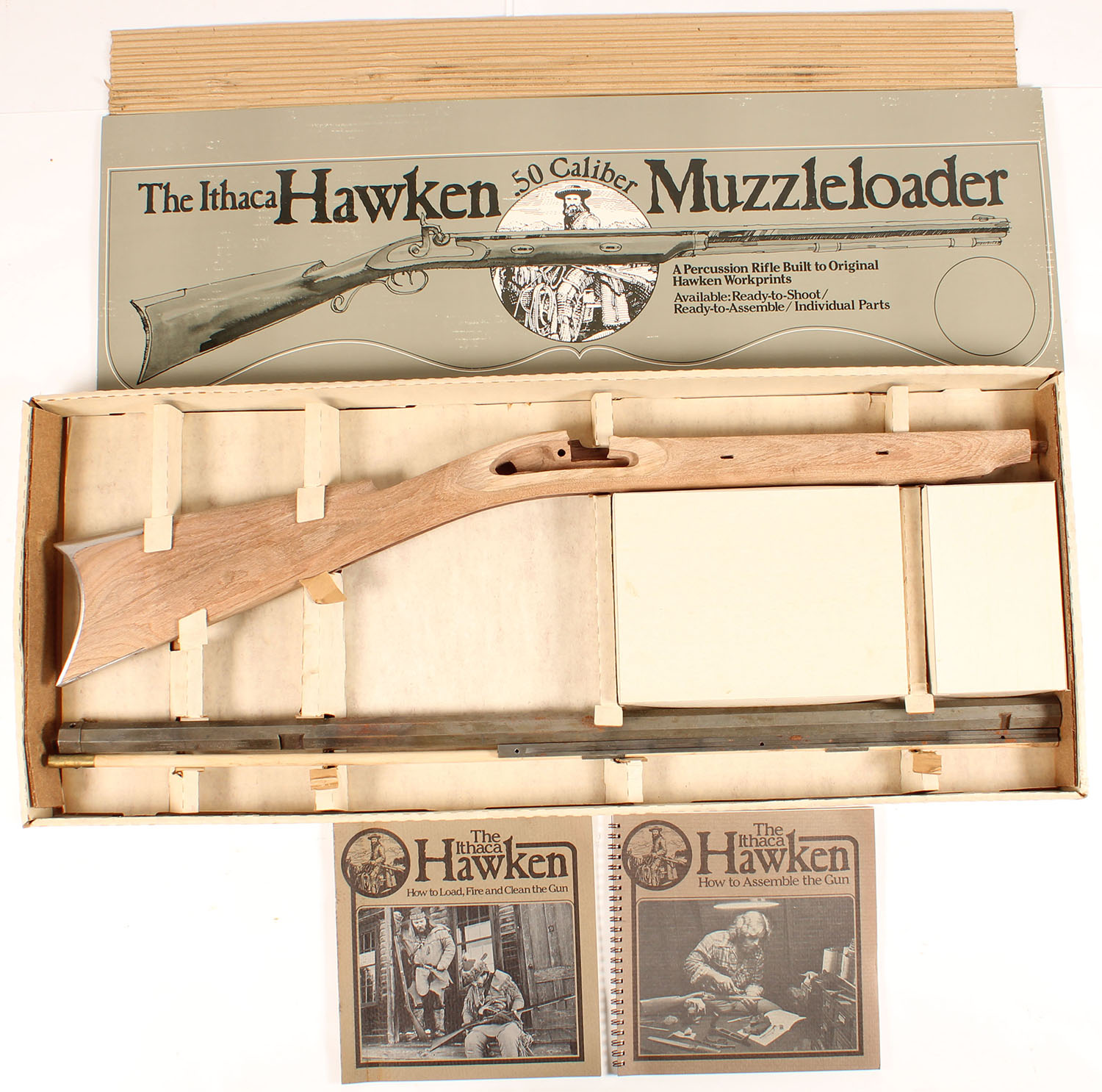 The Ithaca Hawken Muzzleloader Rifle assembly kit. New old stock from 1977. Every part you need to assemble this 50 caliber rifle, including the ''How to Assemble the Gun'' manual with full size blueprint & the ''How to Load, Fire and Clean the Gun'' manual. 32 1/2'' barrel, stock ramrod & two boxes of smaller components. The parts all remain in excellent shape. Comes in the original box & outer shipping box from Ithaca N.Y. No FFL Req. - Value: 250 to 400