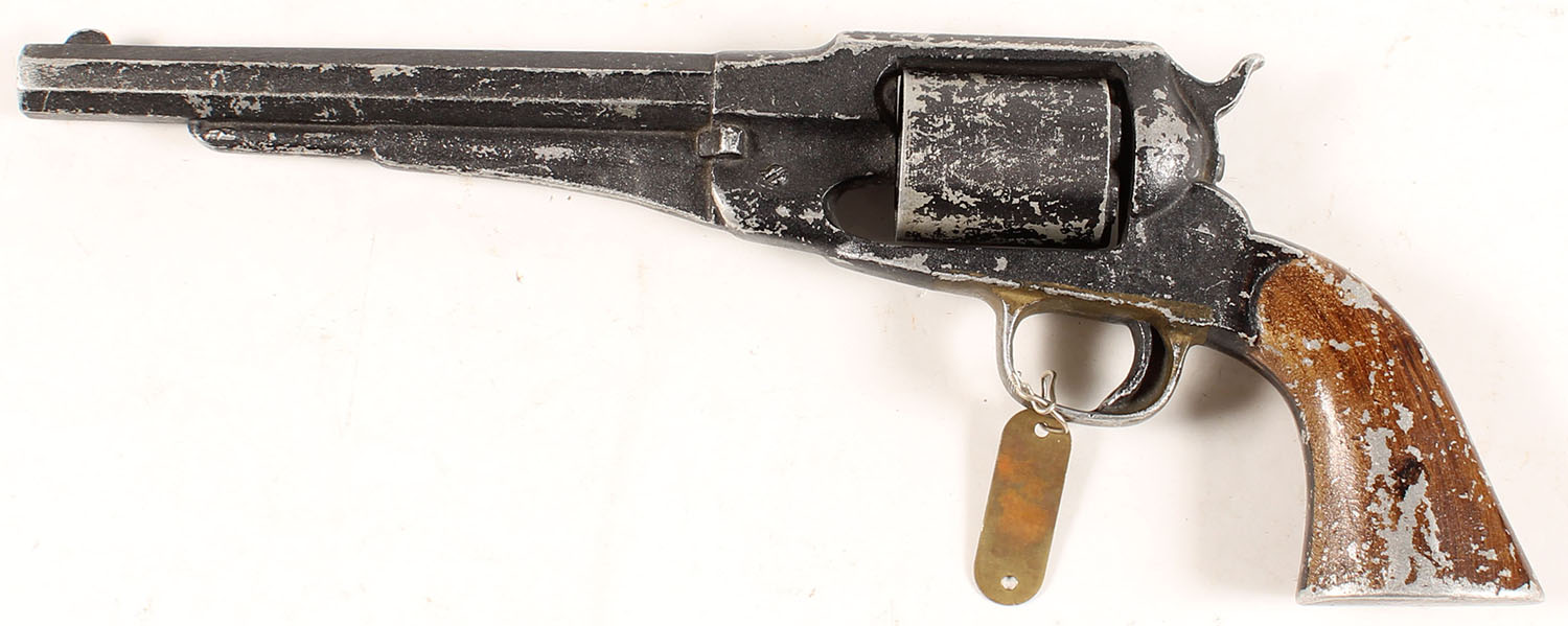 MGM Movie Prop, Full size copy of a Remington 1856 cap & ball revolver. Wall Hanger. Full aluminum composition, hand painted, with wear, scratches & flaking to the paint coverage. 14'' overall. Cylinder rotates. No markings, except carries a brass tag on trigger guard which is stamped ''MGM STUDIO PROPERTY CULVER CITY CAL.''. Very good overall & cool piece of history from the era of old western movies. - Value: 150 to 300