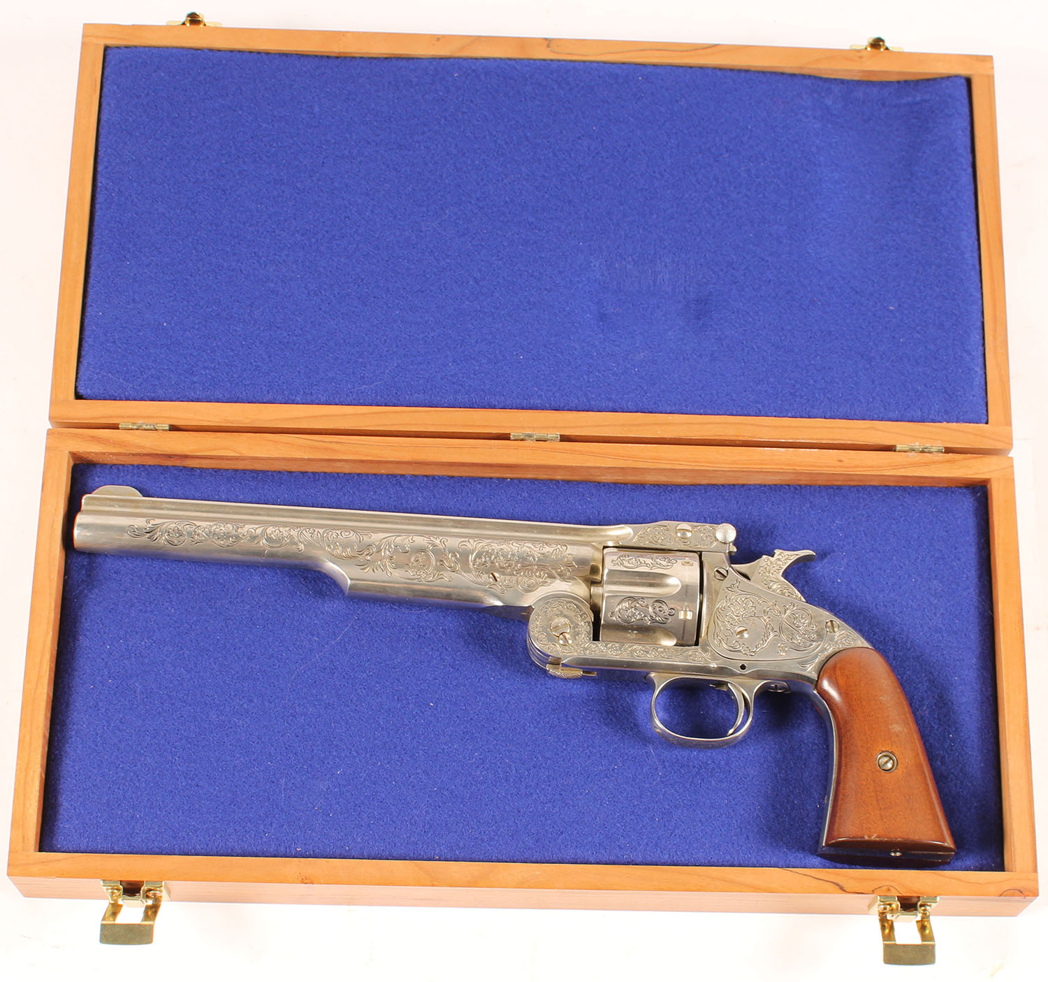 CASED Movie Prop, Full size copy of an engraved S&W #3 Schofield .45 Cal revolver. Full steel composition, nickeled & wooden grips. Revolver replicates funtionality, with top break, hammer movement & cylinder rotates. 14'' overall. No markings, except SN stamped on bottom strap. Excellent overall. Come is a blue felt lined wooded display box. Very realistic & high quality replica. - Value: 200 to 400