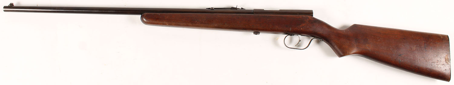 PARTS GUN, Marlin, Model: 100, .22 S.L.LR. Cal., MFG: 1936, SN: None, Single Shot Bolt Action Rifle, 24'' Barrel, The original flat pistol grip stock is very good, with minor scratches, scrapes & contusions to the thinning original finish. The original metal blue finish is toning brown, with 70% coverage on the barrel & 50% on the receiver. Bore is excellent. Barrel carries an adjustable rear & blade front sight. Smooth metal buttplate. The bolt, bolt handle & several other internal parts are all missing. We do not know all parts which are missing. Therefore, this rifle is being sold ''AS-IS, with NO RETURNS & a recommendation for gunsmith repair. FFL or C&R Req. - Value: 80 to 150