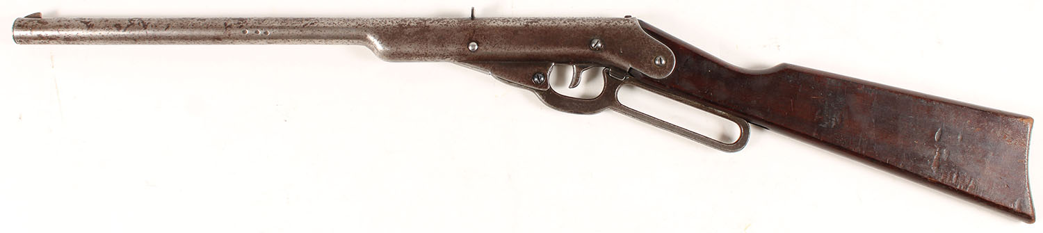 Daisy No. 101. Model 33 ''Daisy for a Buck'' Lever BB/.175 rifle, MFG 1933-35. The original flat board stock is very good, with several minor scrapes, scratches & use marks to the original finish. Made without buttplate. Blued metal finish worn to spotty brown patina. Original sights. Excellent lever action compression. Appearance & function very good overall. - Value: 40 to 80