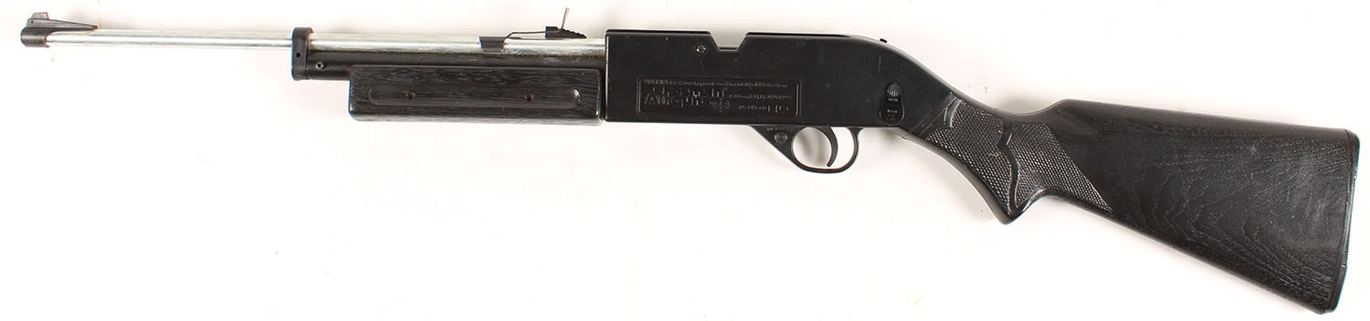 Crosman Model 760-D ''PumpMaster'' .177 pellet/BB rifle, MFG modern. The original plastic stocks are excellent, no visible cracks. Plastic buttplate. Nickeled barrel & black paint metal finish is excellent, Original sights. Excellent pump action compression. Safety on trigger guard. Appearance & function is excellent overall. - Value: 15 to 30