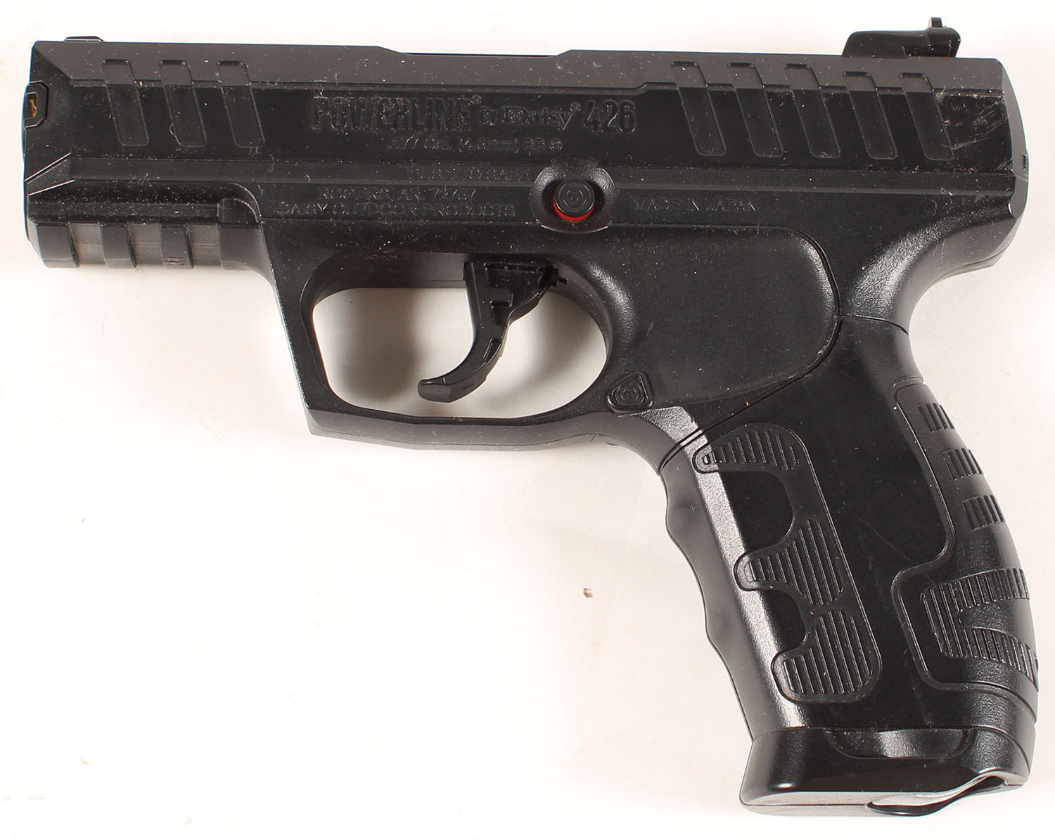 Daisy, Powerline 426, Cal:.177 BB, S/N: 17J35809, takes CO2 canisters, plastic frame, has a spring missing from the inside, spring comes with the gun. Grade: Very Good - Value: 10 to 40
