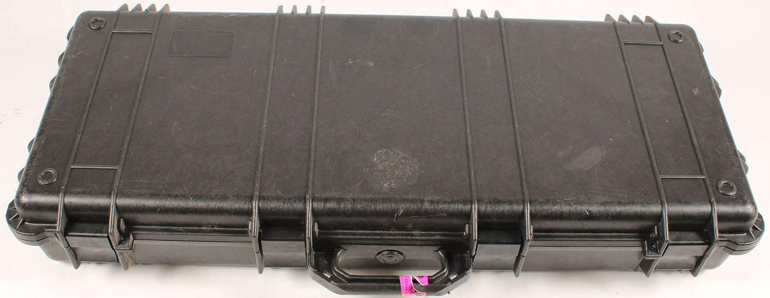 Pelican, Black plastic roller gun case, has foam, inside measures 35 3/4'' x 13 3/4''. Grade: Very Good + - Value: 40 to 120