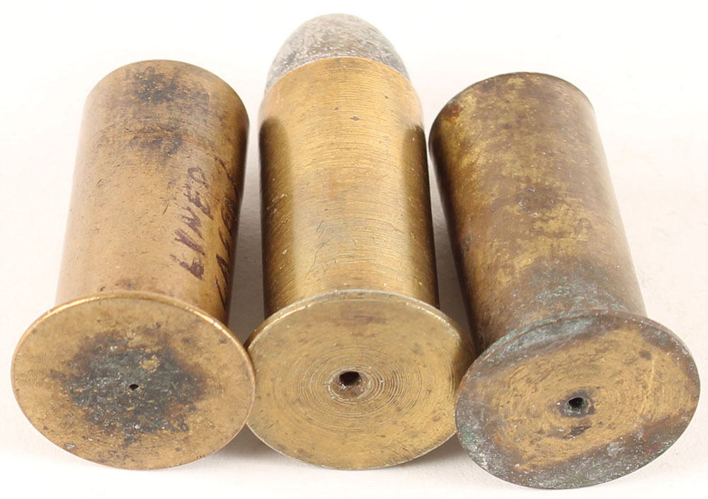 Lot of 3 .50 Maynard cart., one modern made, one loaded with FNL & one empty case. Grade: Very Good ++ - Value: 10 to 20