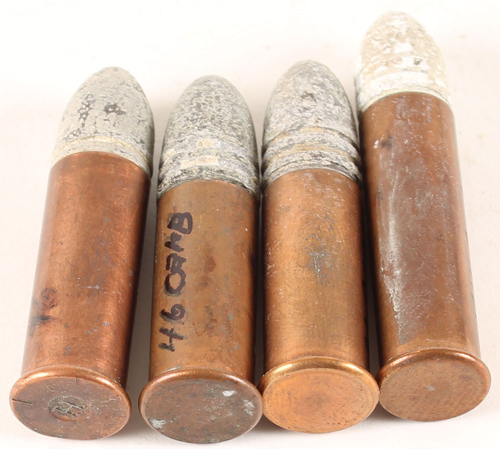 Lot of 4 Rim Fire with Pt. RNL, (1) .46 Long Raised ''H'', (1) .44 Extra Long no H/S, (2) .46 Carbine no H/S. Grade: Excellent - Value: 20 to 40
