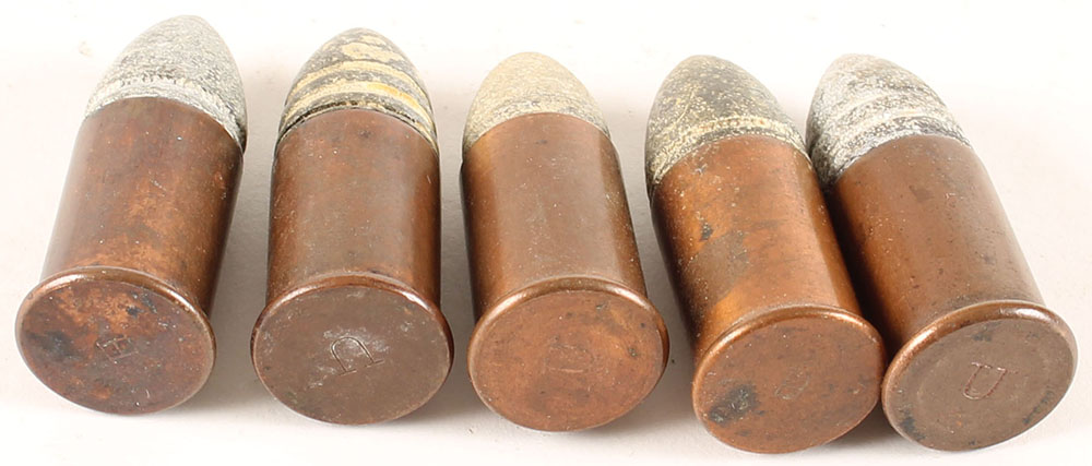Lot of 5. 56-56 Spencer Rifle. (3) HS:''U'' impressed, PT Lead. (2) HS:''H'', one raised in circle and one impressed. PT Lead. Grade Excellent - Value: 60 to 120