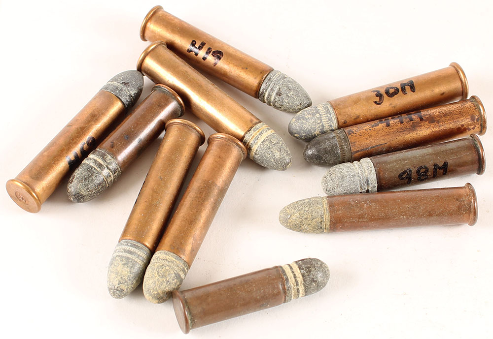Lot of 11, .38 Extra Long Ballard Rim Fire, short & logn case, LD, small & large Raised ''H'' in circle indent,m ''U'' & ''US'' Raised in circle indent, no H/S made by H.W. Mason & CTM Co., Board Dummy with Imp ''H'', Imp. ''U'' & ''H''. Grade: Excellent - Value: 50 to 200