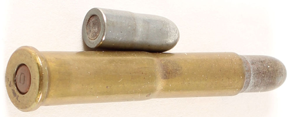 6mm S&W Expirimental (1.55'' case). NHS. RN tinned FMJ. Also included is a separate projectile. A scarce caliber. Grade Excellent - Value: 70 to 150