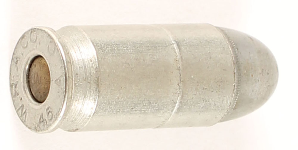 H/S: W.R.A.Co. .45 A.C., .45 ACP PROOF, SCARCE, W underlined on round Br. Pri, case cannelure, tinned case, FMJ, tinned jacket, knurl on bullet by case mouth. Grade: Excellent - Value: 90 to 150