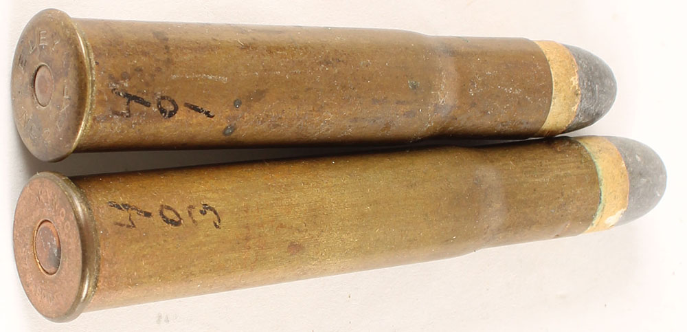 Lot of 2. British Sporting Cartridges. (1) 577-500 Express (3.11'' case). HS:''KYNOCH 577-500'', RN PP Lead with copper tube. (1) 577-500 #2 Express (2.81'' case), HS:''ELEY No 2 EXP'', RN PP Lead with a brass colored tube. Grade Very Good - Value: 30 to 60