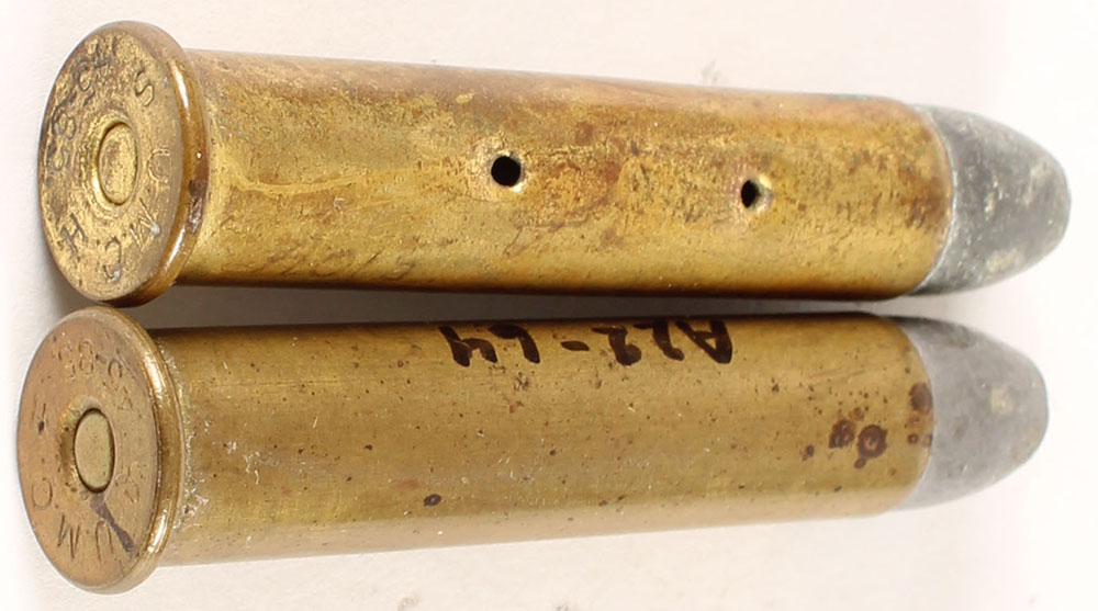 Lot of 2. 45-85 Bullard. Both HS:''U.M.C. H 45-85 S''. (1) FN Lead with copper tube. (1) FN Lead Board Dummy with two mounting holes, no wood spacer noted. Grade Very Good + - Value: 40 to 80