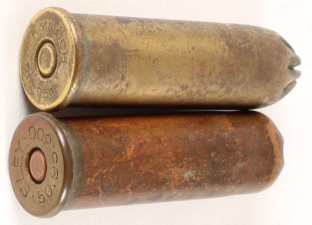 Lot of 2, 50-95 EX, Blanks, 1 Eley .50-95-300 Fl. Cop. Pri., 8 petal rose crimp, 1 KYNOCH .50-95 W, Fl Br. Pril, 9 petal rose crimp. Grade: Excellent - Value: 50 to 200