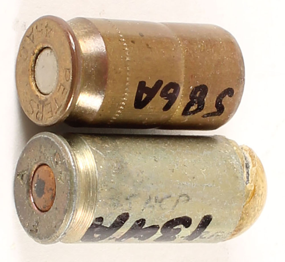 Lot of 2, .45 ACP, Peters 45 S.C, Tear Gas, brown wad at case mouth that says ''FEDERAL GAS'' on two lines, wad heavlily waxed, T 92 singal cart, F A 45, Fl. Cop. Pri., steel case, the tracer compound is housed in a tan translucent plastic shell. Grade: Excellent - Value: 60 to 200