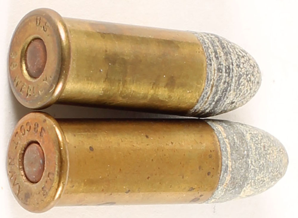 Lot of 2 cart., (1) H/S: US 38 COLT NAVY, Gr. Pt. RNL, Cop. Pri., (1) H/S: US 38 WEBLEY, Gr. Pt. RNL, Cop. Pri. Grade: Excellent - Value: 20 to 40