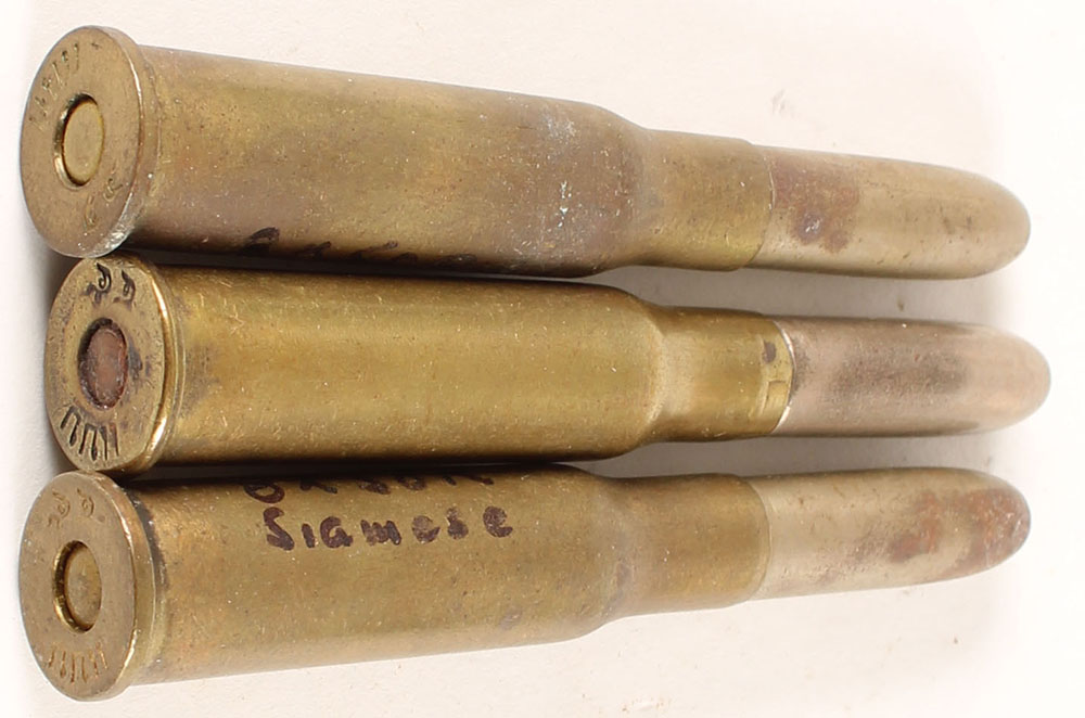 Lot of 3. 8x50 Siamese Mauser. HS: Siamese characters. RN CN FMJ. Two have flat primers and one is domed. Grade Very Good - Value: 20 to 40