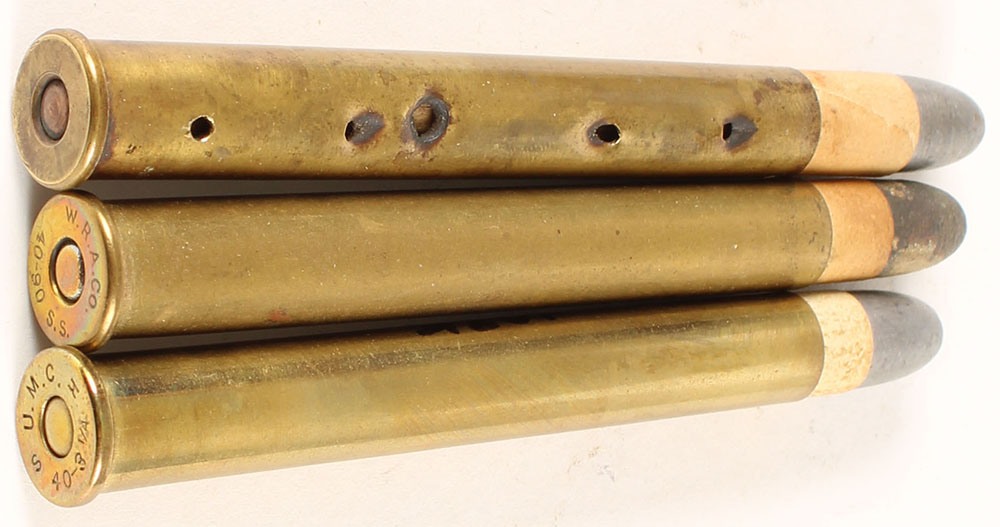 Lot of 3, 40-90 Sharps Straight (3.25'' case). (1) HS:''U.M.C. H 40-31/4 S'', FN PP Lead. (1) HS:'' W.R.A.Co. 40-90 S.S.'', FN PP Lead. (1) NHS, FN PP Lead, Board Dummy with four mounting holes, one small observatioin hole near the base and a rod spacer visable. Grade Excellent - Value: 60 to 120