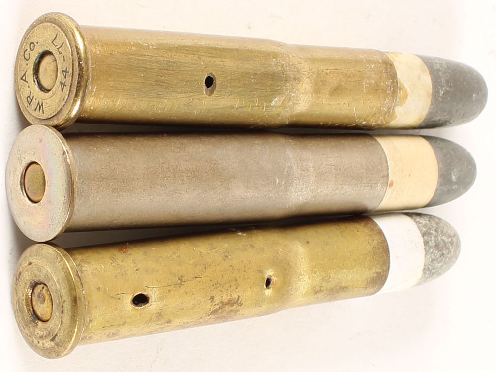 Lot of 3. 44-77 Sharps & Remington bottleneck (2.25'' case). (1) HS:''W.R.A.Co. 44-77'', RN PP Lead, Dummy with one small hole with spacer in case. (1) NHS. RN PP Lead, Board Dummy with two mounting holes and no apparent spacer. (1) NHS, RN PP Lead, Nickeled case. Grade Very Good ++ - Value: 50 to 200