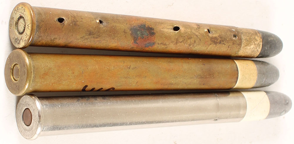 Lot of 3. 40-90 Sharps Straight (3.25'' case). (1) HS:''W.R.A.Co. 40-90 S.S.'', FN PP Lead. Board Dummy with four mounting holes along case and one punch crimp at casemouth. (1) NHS, FN PP Lead. (1) NHS, FN PP Lead, Nickeled case. Grade Very Good ++ - Value: 30 to 120