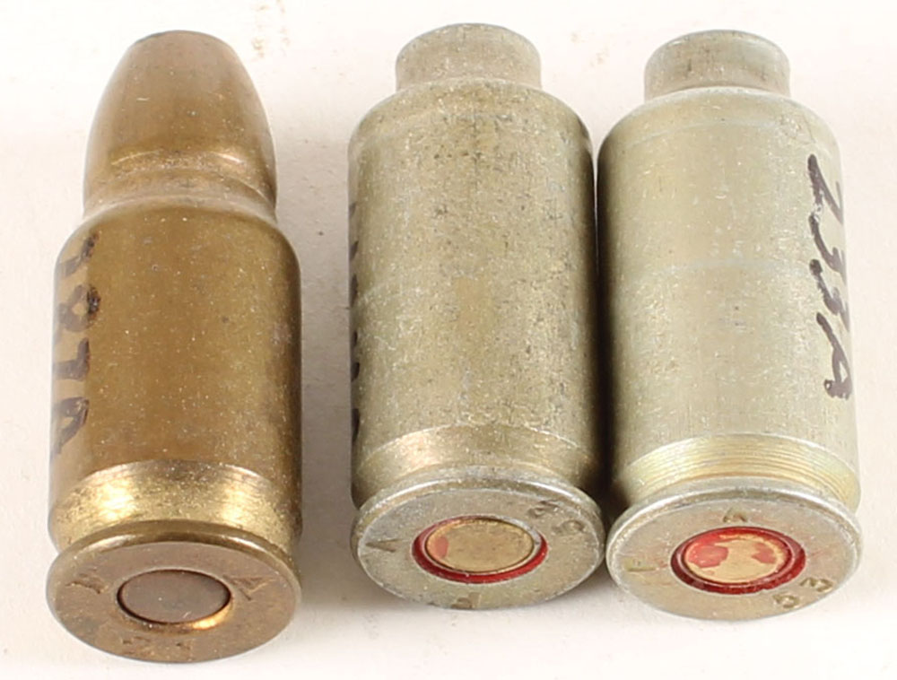 Lot of 3, 45 ACP, Blank, F A 21, flat copper primer, case cannelure on necked down part of body, see HWS Vol.1 page 34 fig. 49 item B,F A 52, flat brass primer, red primer sealant, full ring crimp, red wad, F A 53, flat brass primer, red primer sealant, full ring crimp, red wad. Grade: Excellent - Value: 70 to 120