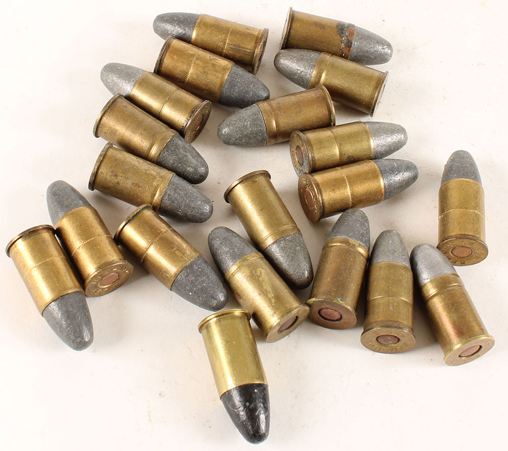 Lot of 20. .455 Webley Revolver. (10) HS:''REM-UMC 455 II''. (1) HS:''G.F.L. 455 MK II''. (1) HS:''ELEY.NITRO . .455 .''. (4) By Royal Labs with different headstamp codings. (3) By Kynoch with different headstamp codings. (1) By Eley, HS:''E C II'', . All have RN Lead projectiles. Grade Very Good ++ - Value: 10 to 60