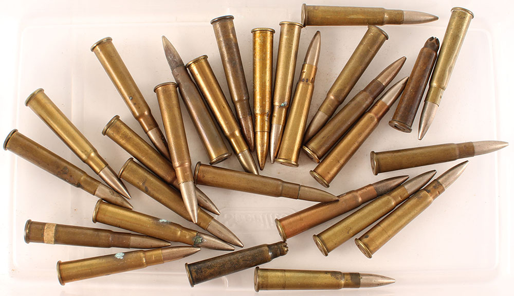 Lot of 28. .303 British, World War I era production. (16) British produced by ''J'', ''G'', ''M'' and Government Factory #1. All Ball loads with PT CN FMJ. (10) US produced cartridges by ''RA'', ''P'', ''US'', ''W'', and ''U''. All Ball loads with PT CN FMJ. (2) Blanks headstamped ''R^L & ''B''. Grade Very Good - Value: 20 to 40