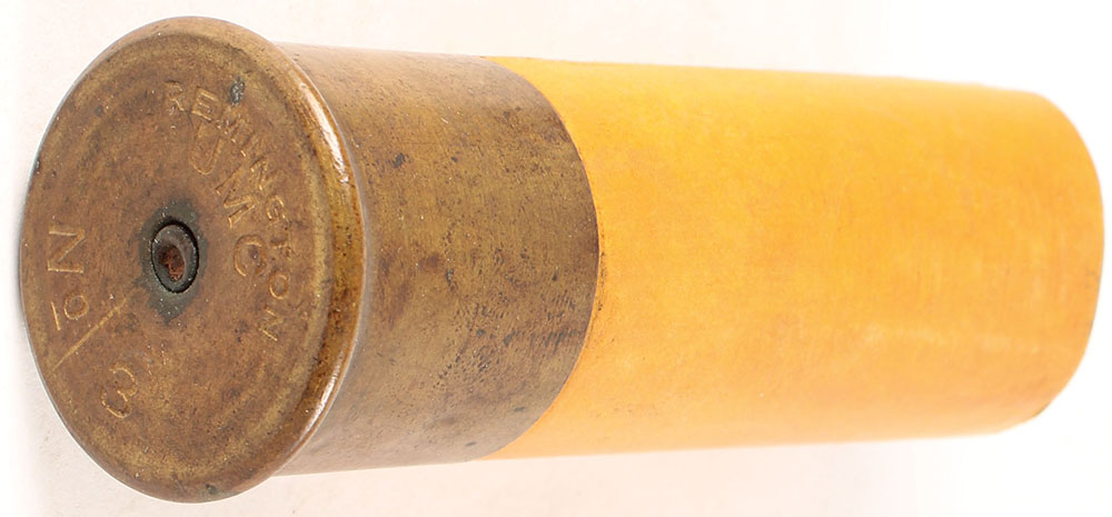 Remington UMC No. 3ga, NPE with dented primer, Empty tan paper, 4 13/16'' OAL. Grade: Very Good ++ - Value: 100 to 500