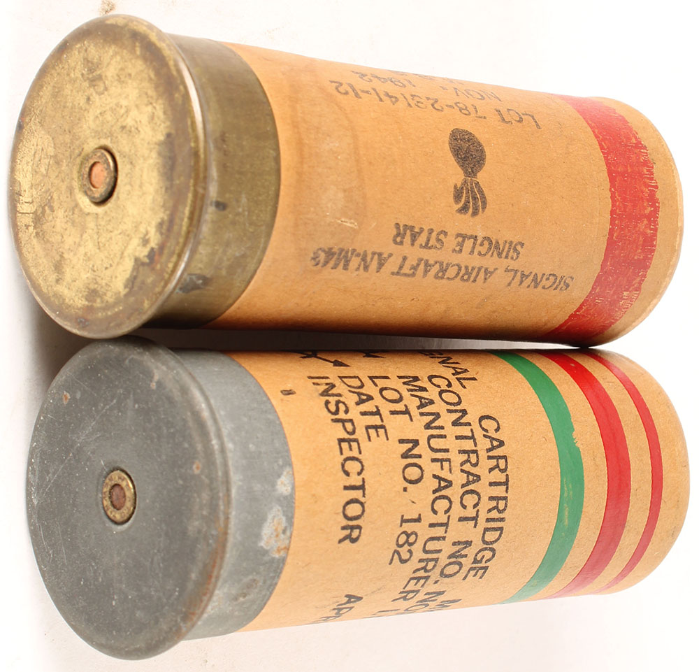Lot of 2, Winchester, signal aircraft flares, loaded (1) is red, (1) red tracer/ red green, 1 1/2'' Dia. Grade: Excellent - Value: 50 to 300
