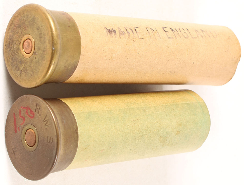 Lot of 2, No. 4 ga., NPE, (1) tan paper shell with ''Made in England'' print, 4'' OAL, (1) fading green paper shell, 3 1/4'' OAL, shells are very good. Grade: Very Good ++ - Value: 30 to 90