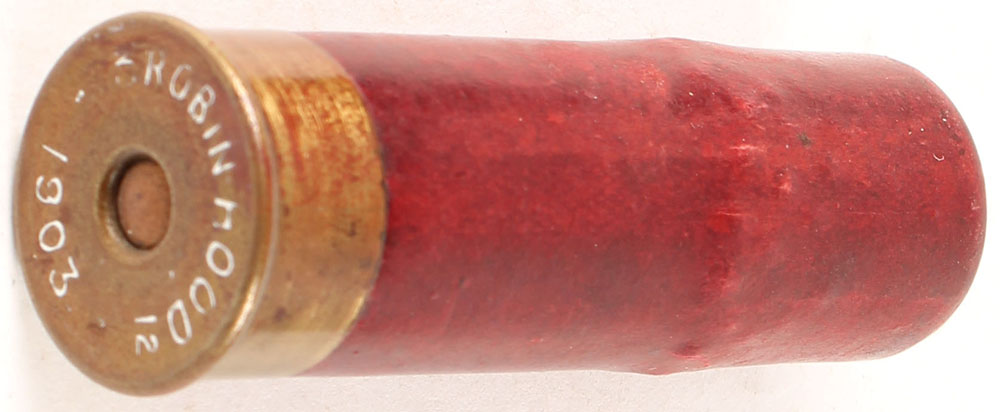 Robin Hood No. 12 1903, loaded red paper case, TW: ROBIN HOOD 3 1 1/8 7 1/2 *****. Shell is slightly swollen. Grade: Very Good ++ - Value: 6 to 30