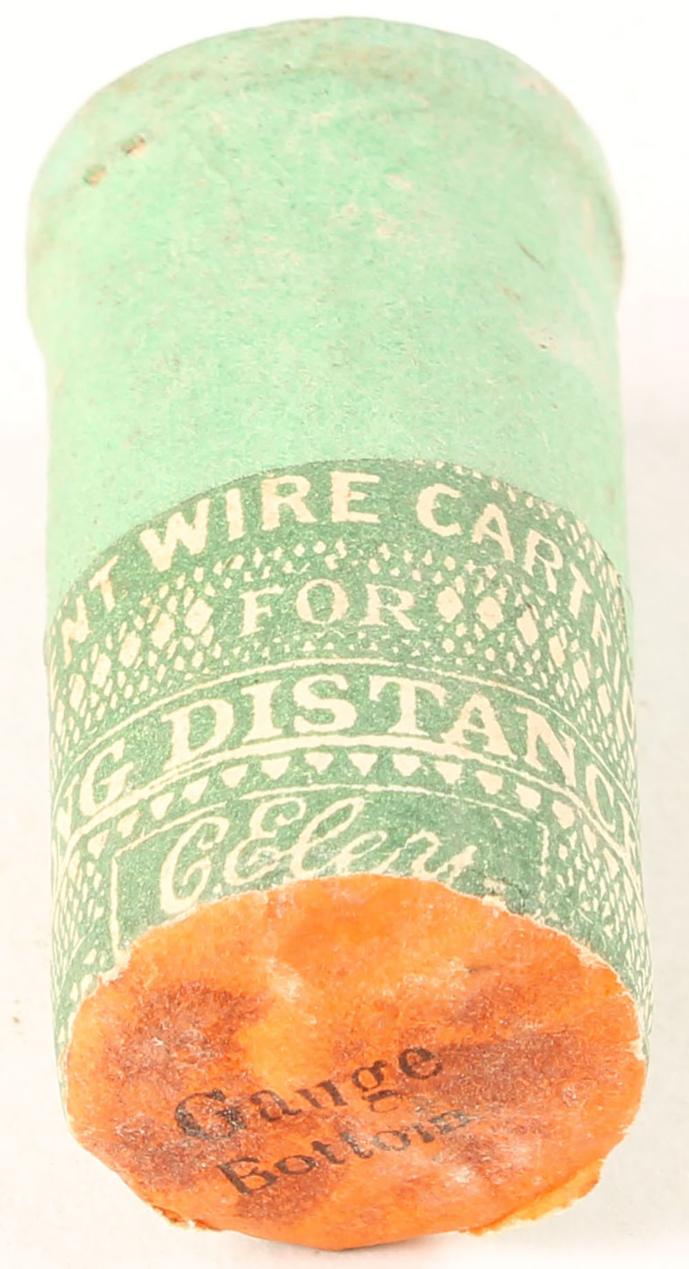 Early Eley's wire and concentrator shot loads. The Eley Brothers began designing shot in the 1820s in London and the company is still in business today and located in Birmingham. Civil Wire Paper wrapped Eley unknown gauge wire shot shell. Base of the cartridge is marked: unknown Gauge Bottom on an orange tag. Grade: Very Good ++ - Value: 10 to 80