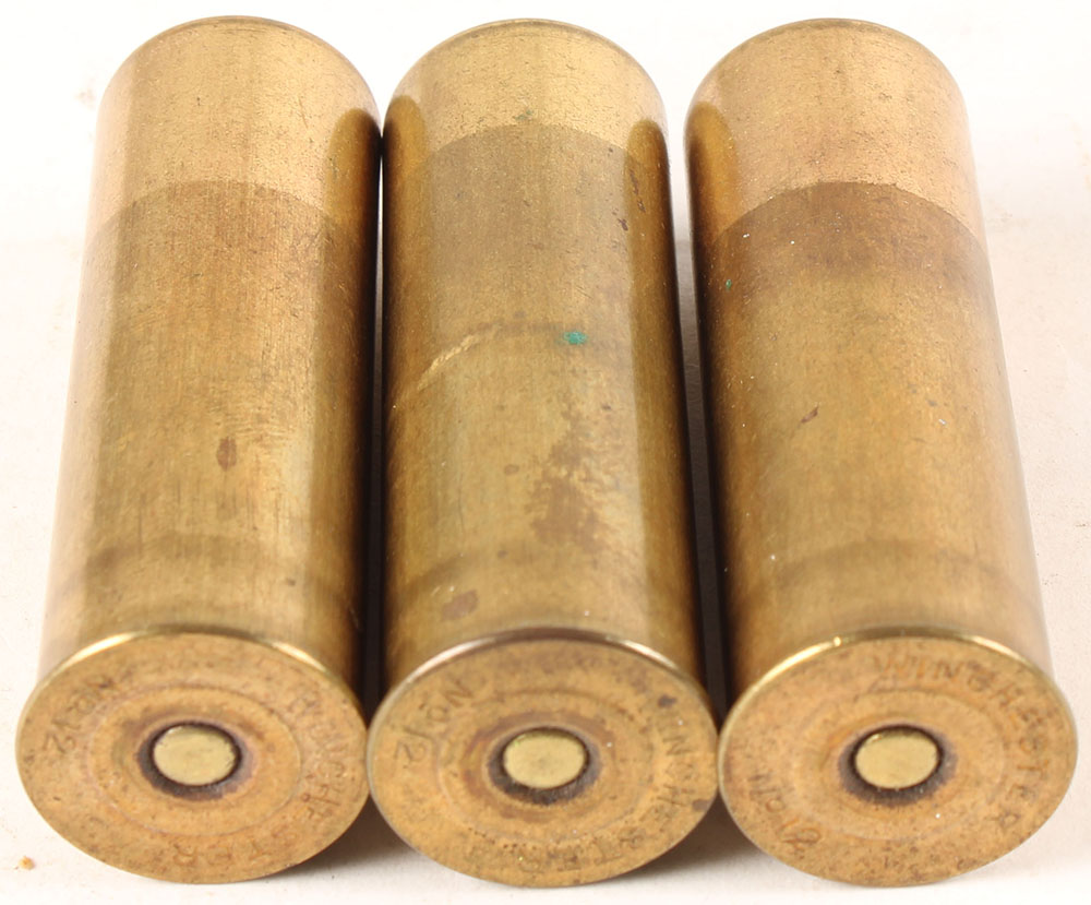 Lot of 3, Winchester No.12, Factory loaded brass shotshells, tan TW. Grade: Excellent + - Value: 10 to 30
