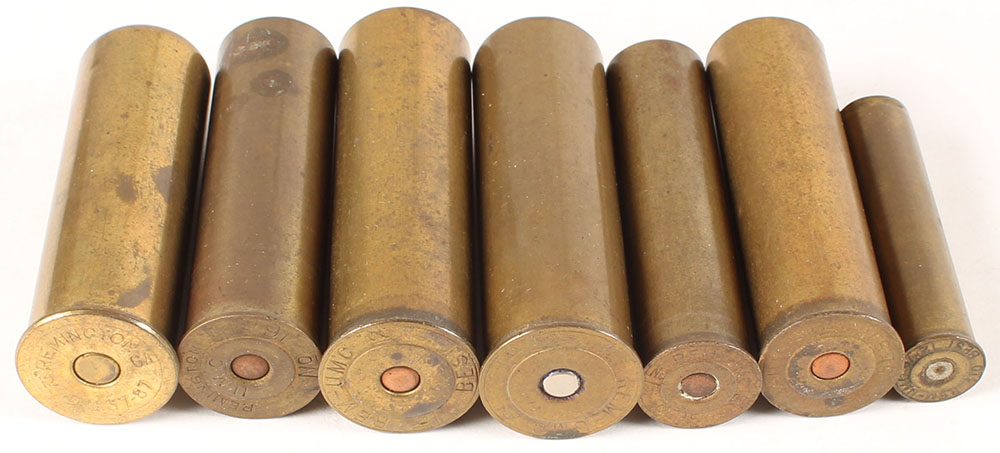 Lot of 7, REM-UMC, brass shot shells, (2) loaded with TW's, (5) NPE. Grade: Excellent - Value: 10 to 60