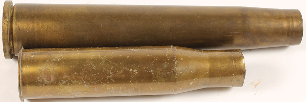 Lot of two, fired shell caseings, one 40mm shell for Bofors AA gun dated 2-1945, one 37mm shell for M3 Anti-tank Gun dated 1942. Grade: Very Good ++ - Value: 10 to 50